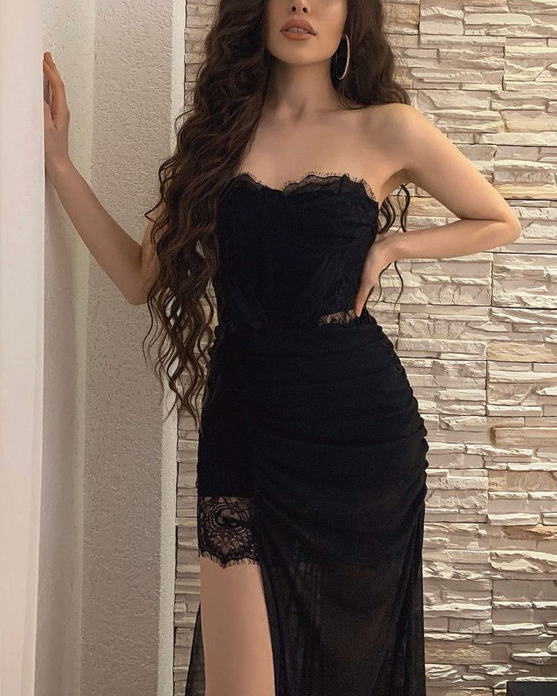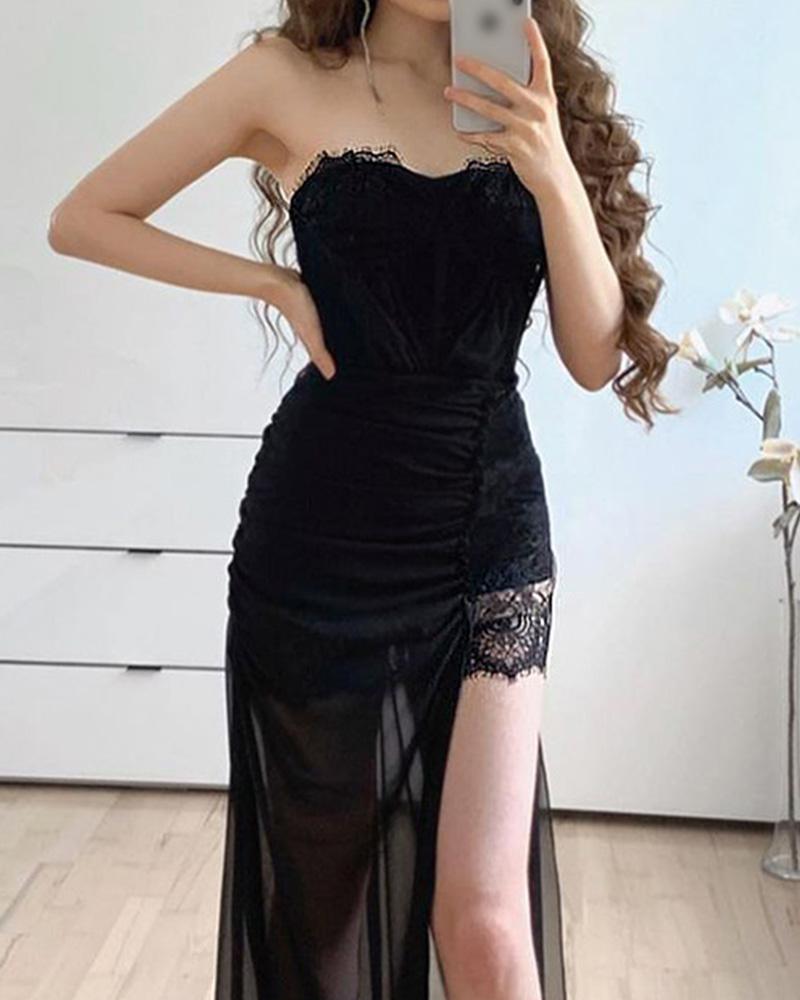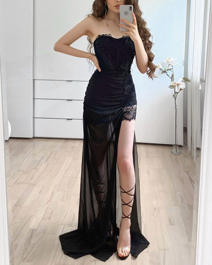 Bandeau Split Thigh Contrast Lace Sheer Mesh Maxi Dress