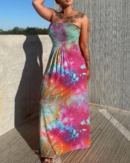 Bandeau Tie Dye Print Ruched Sleeveless Maxi Dress