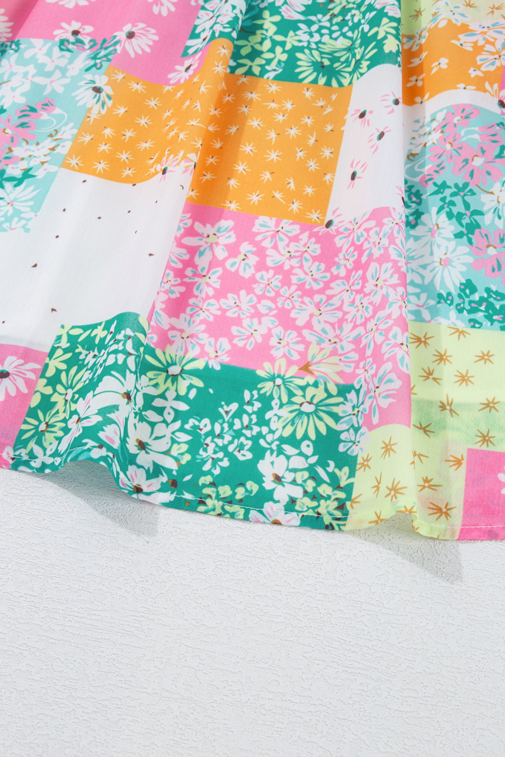 Green Floral Patchwork T Shirt Pleated Loose Fit Mini Dress