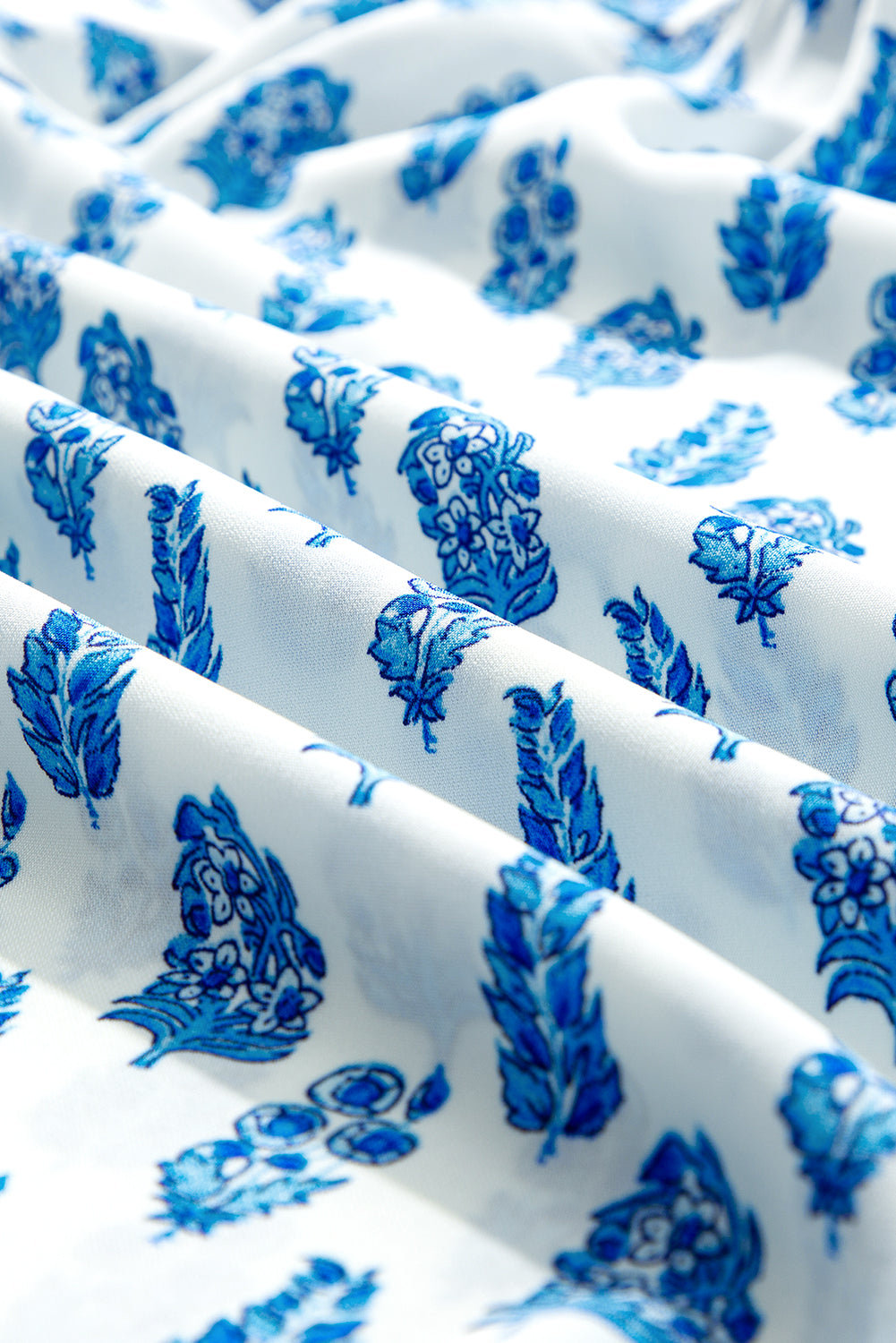 Sky Blue Boho Floral Printed Lantern Sleeve Frilled Neck Shirred Shirt
