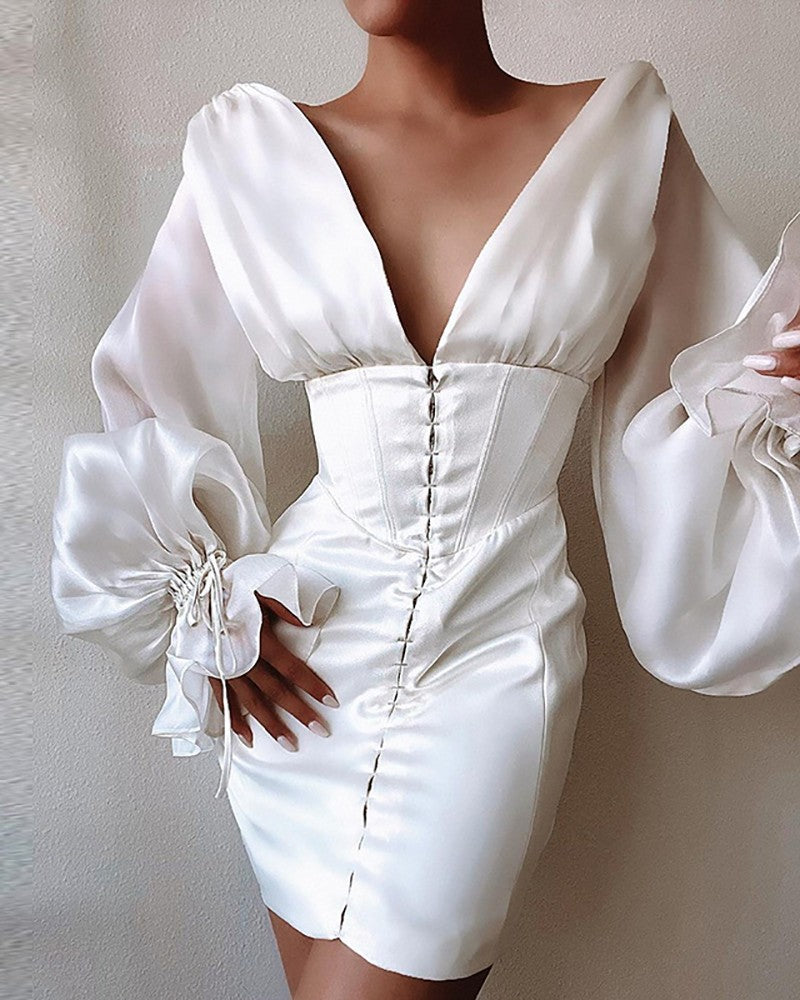 Bell Lantern Sleeve Ruched Corset Bodycon Dress