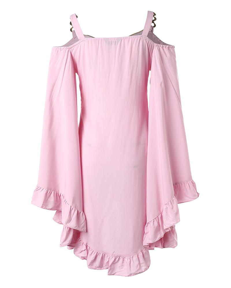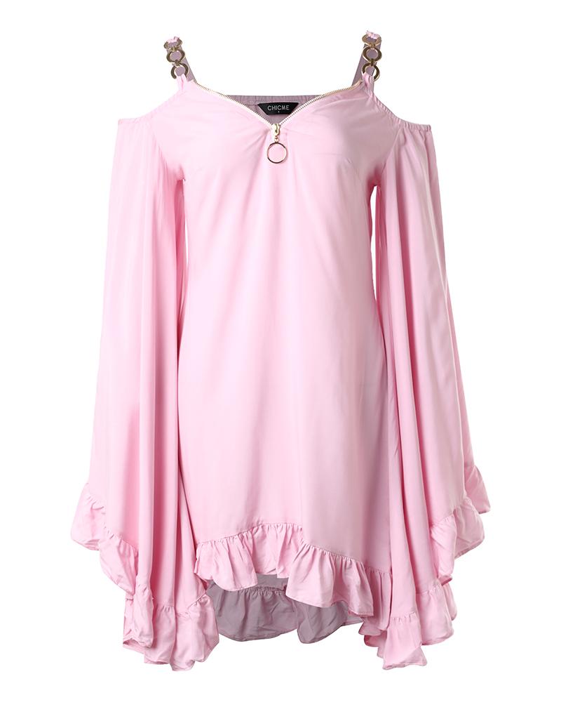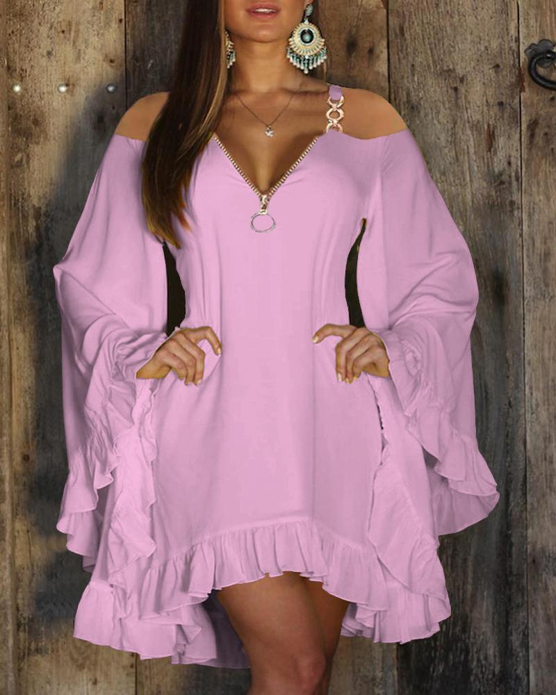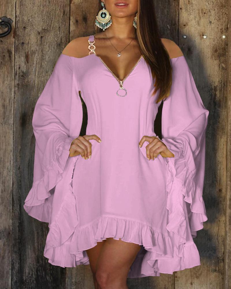 Bell Sleeve Ruffles Zipper Design Casual Dress