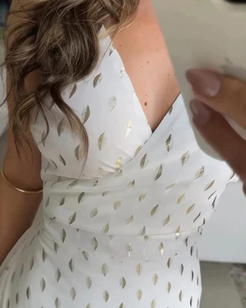 Bronzing V Neck Spaghetti Strap Ruffles Maxi Dress Casual Tied Detail Asymmetrical Dress