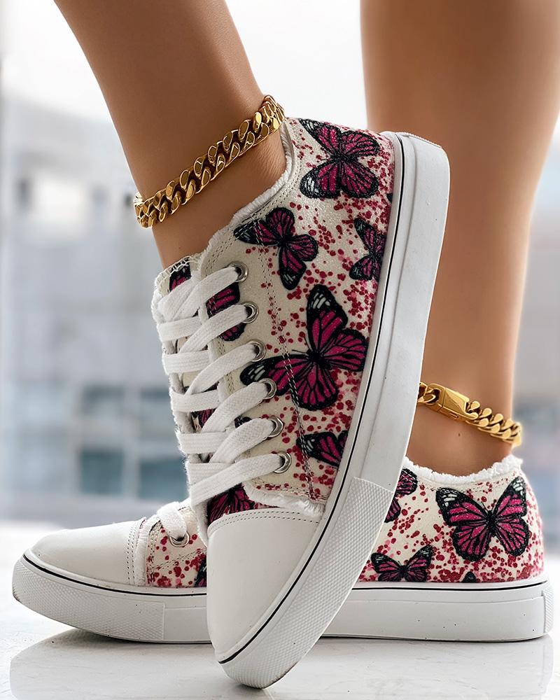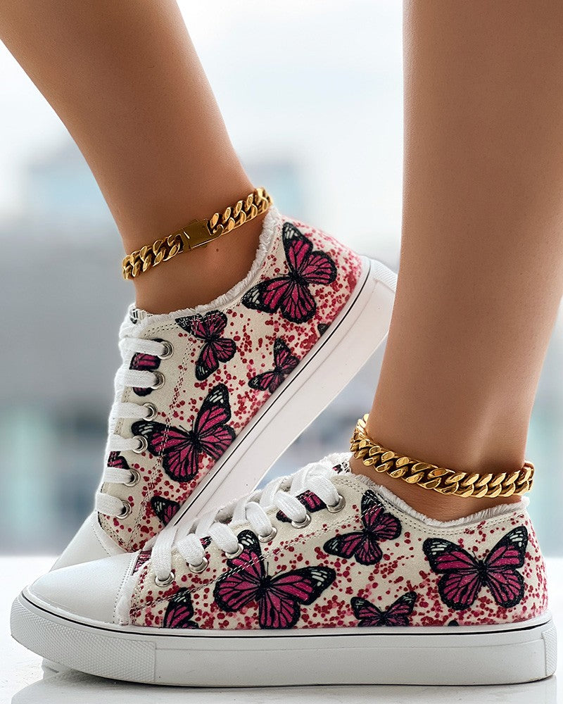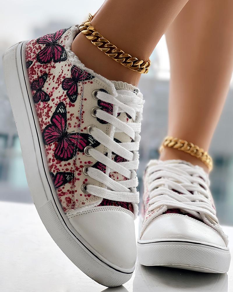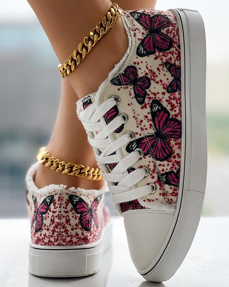 Butterfly Embroidery Raw Hem Lace up Sneakers