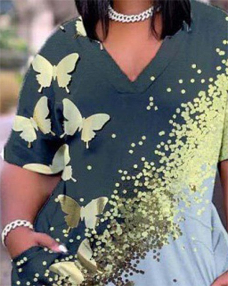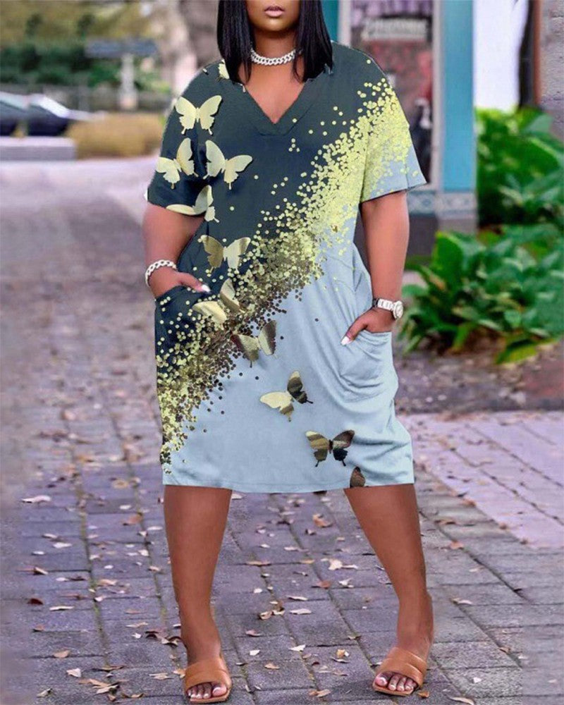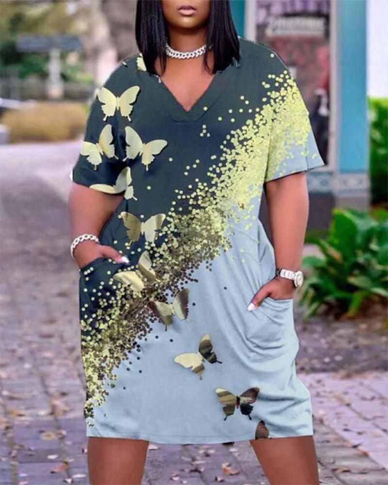Butterfly Print Colorblock Pocket Design Casual Dress