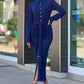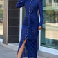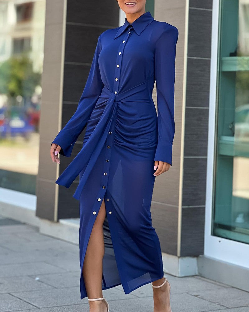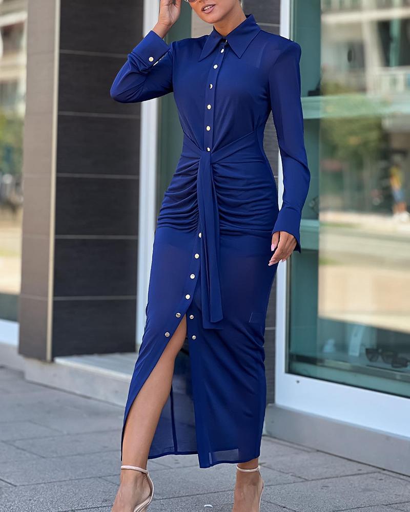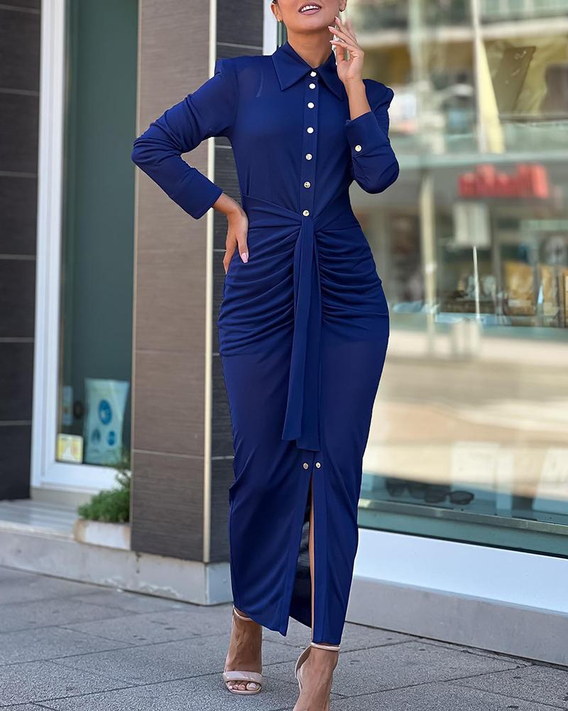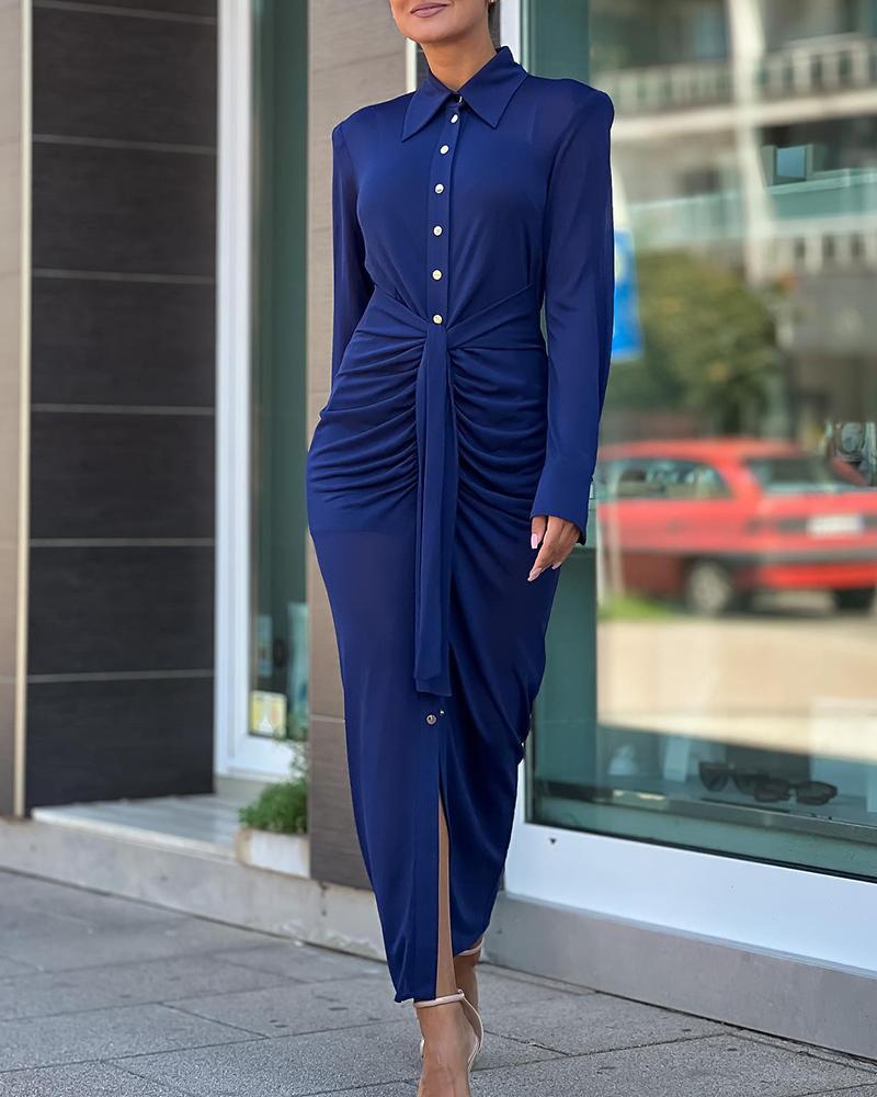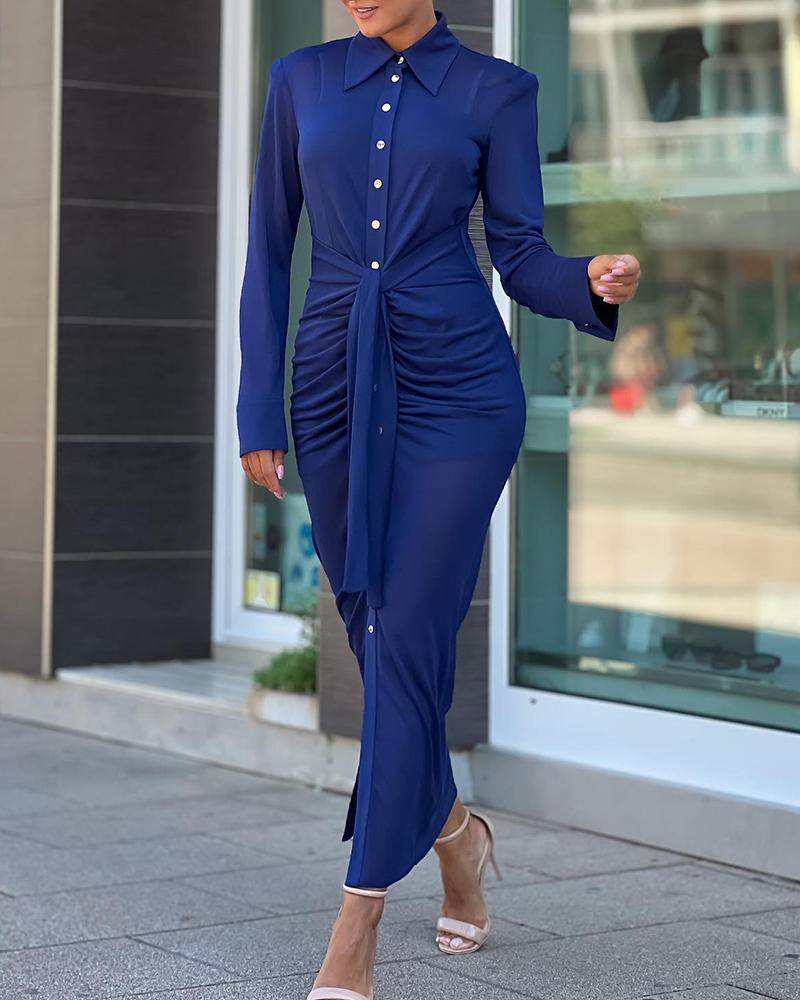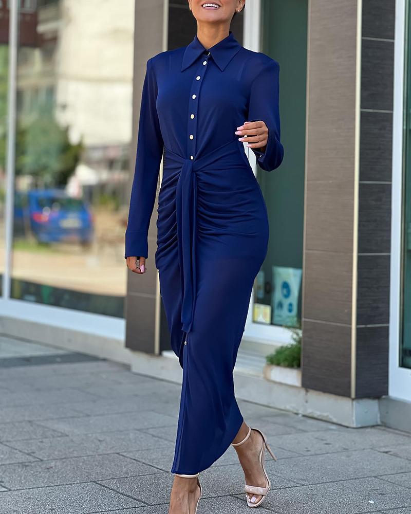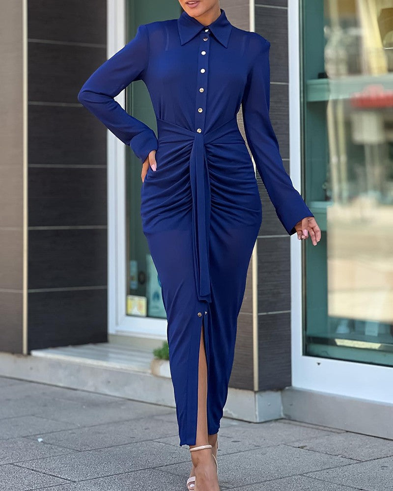 Buttoned Tied Detail Ruched Long Sleeve Dress