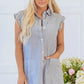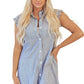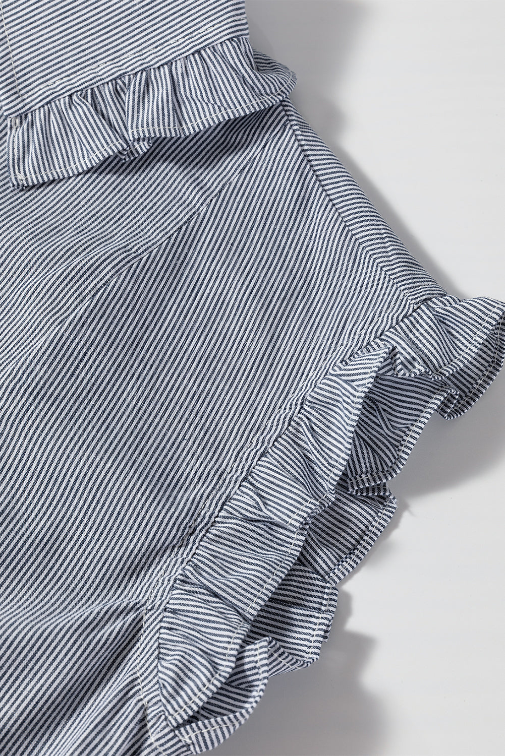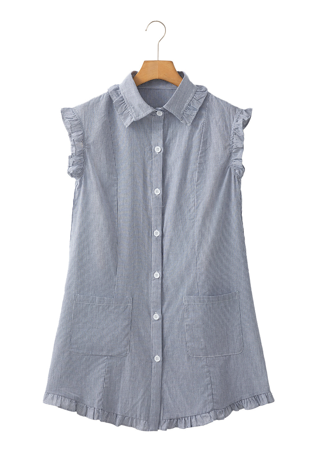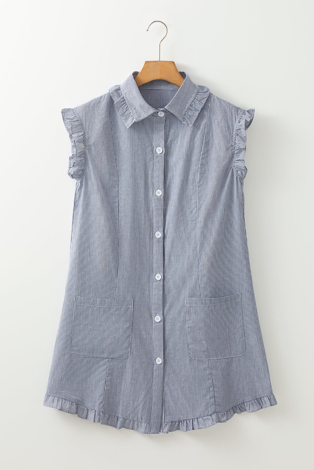 Blue Stripe Frilled Sleeveless Collar Front Pocket Button Up Mini Dress