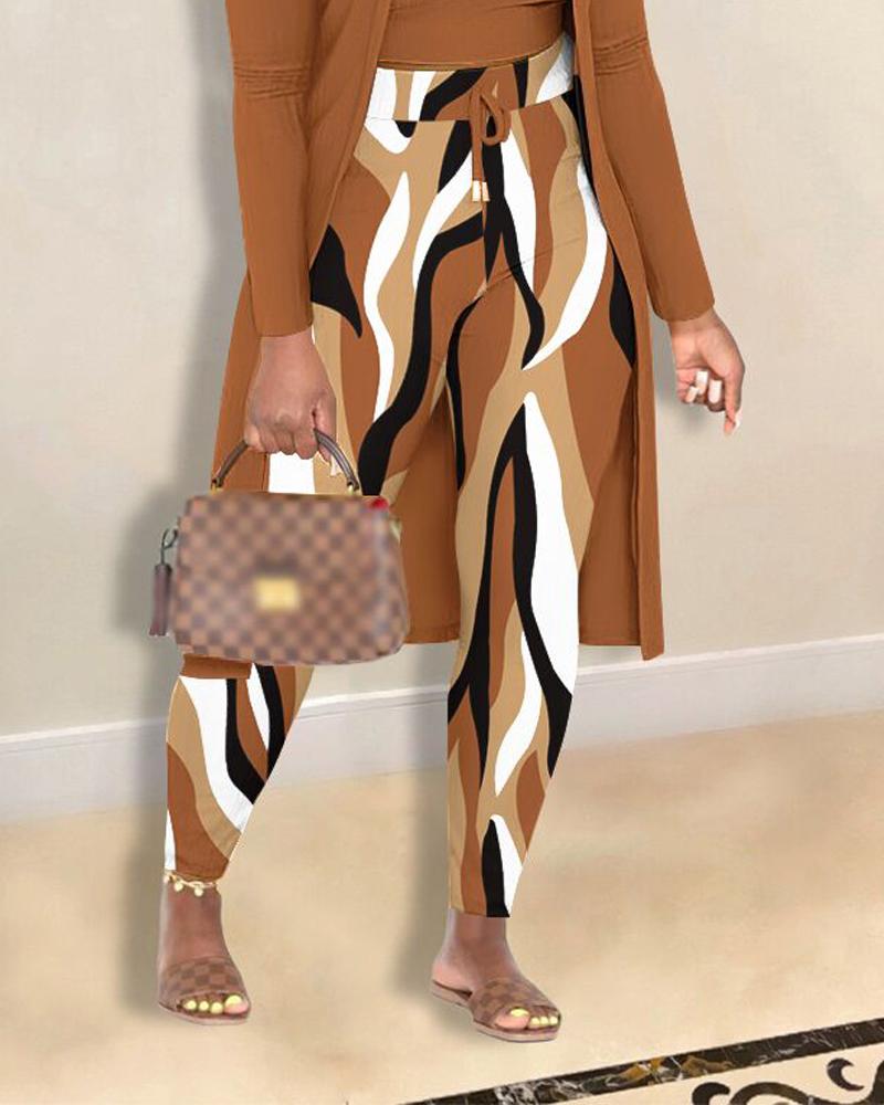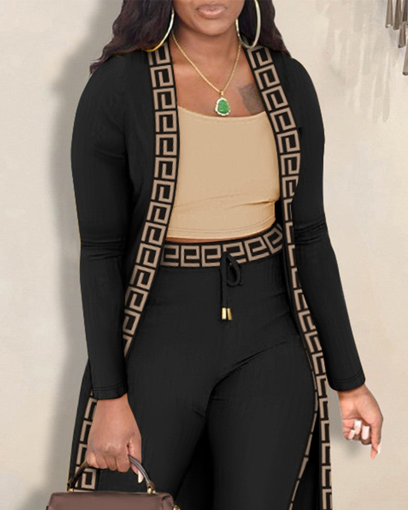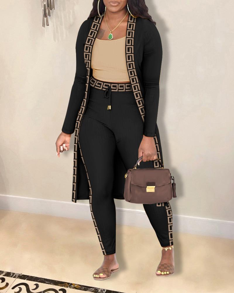 Cami Top & Geometric Print Pants Set With Longline Coat