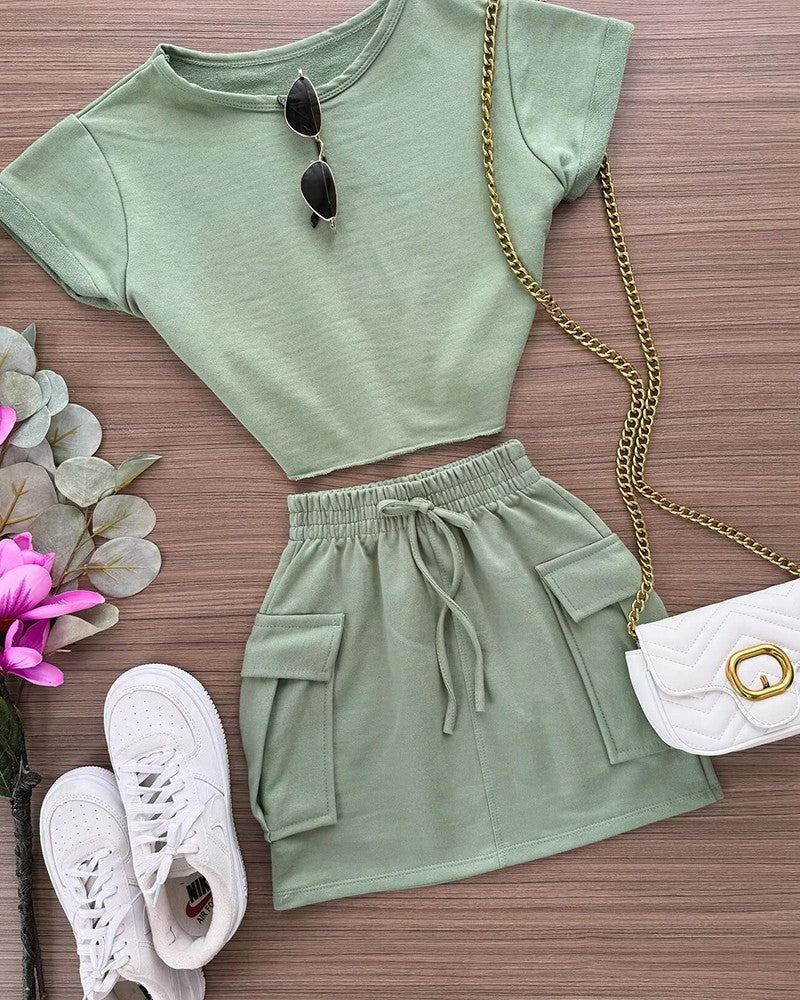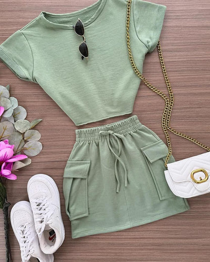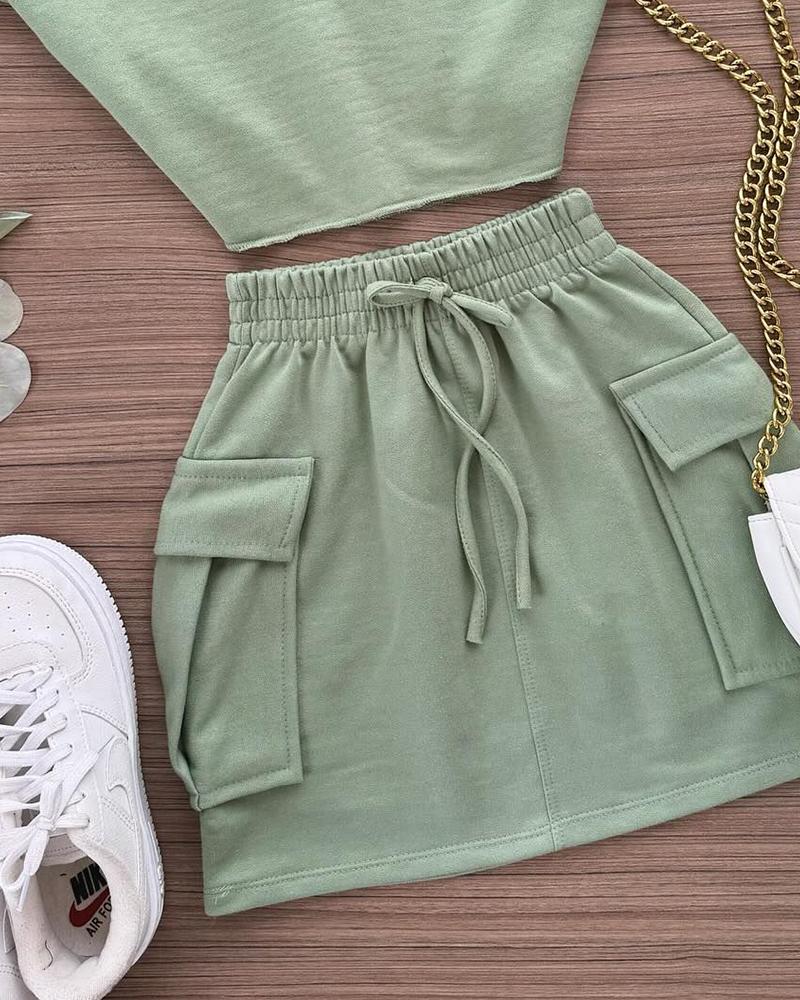 Cap Sleeve Top & Drawstring Flap Pocket Cargo Skirt Set