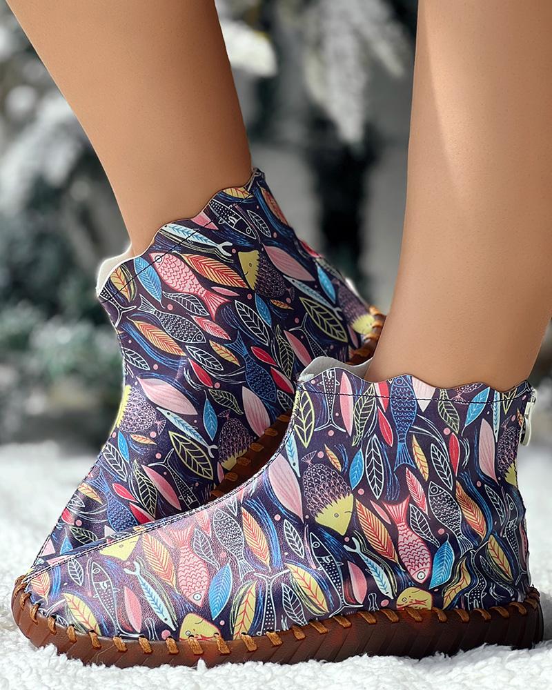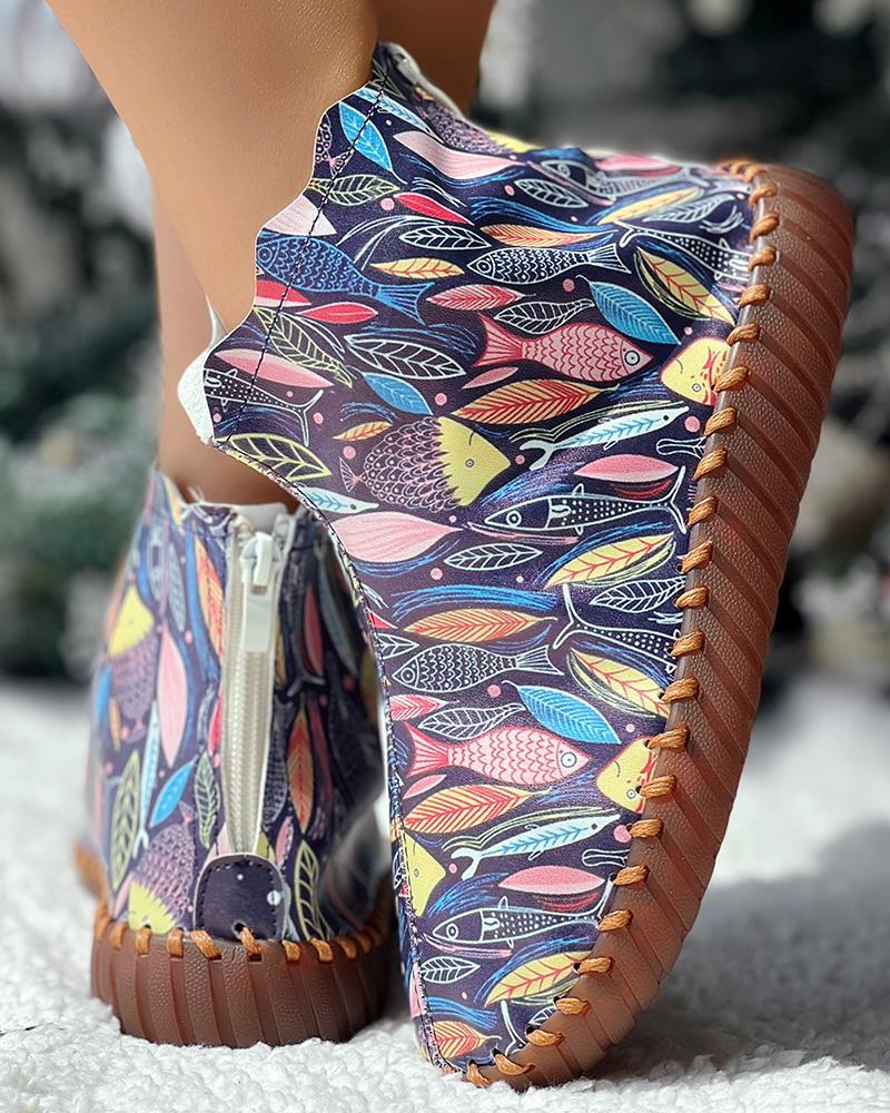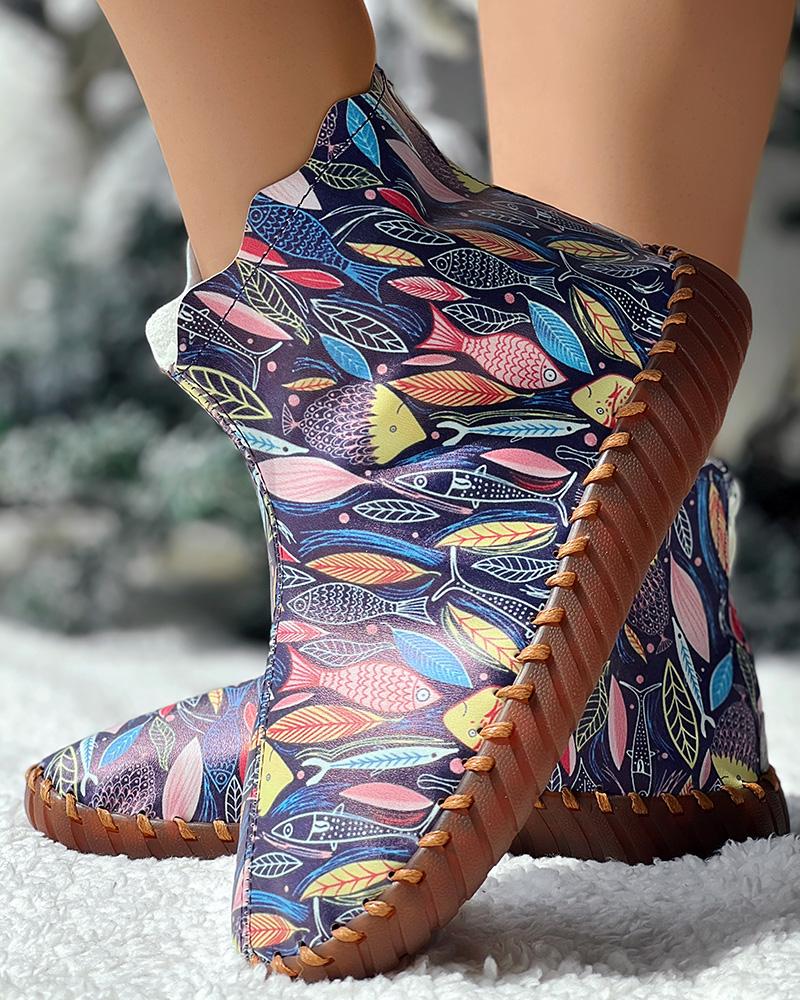 Cartoon Fish Leaf Print Ankle Boots