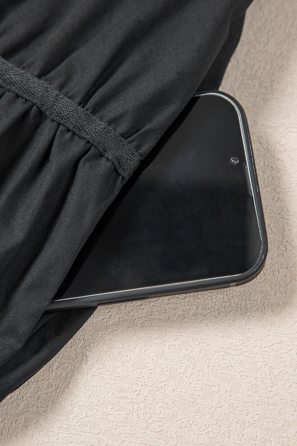 Black Shirt Style Button Down Puff Sleeve Ruffle Hem Dress