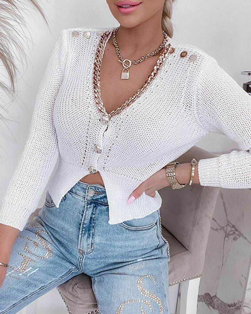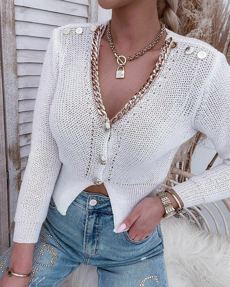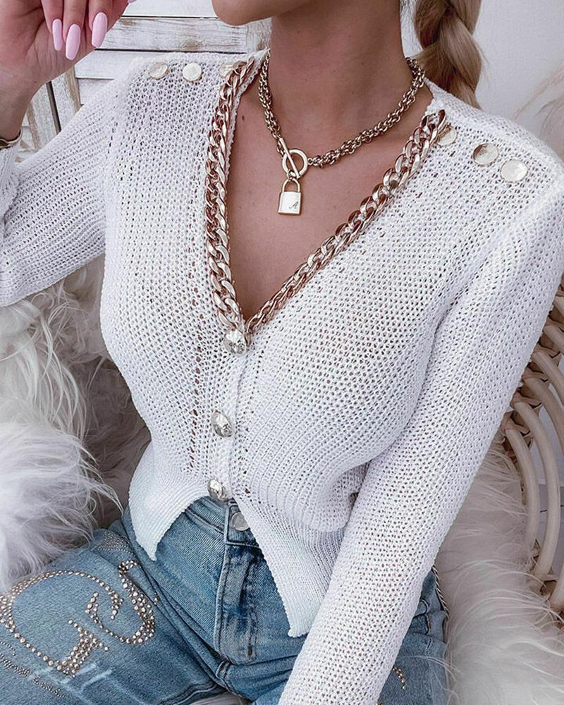 Chain Decor Buttoned Long Sleeve Knit Cardigan