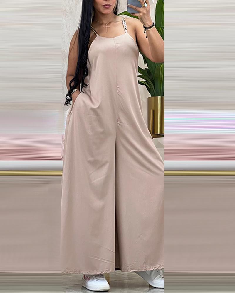 Chain Strap Pocket Design V Neck Wide Leg Jumpsuit