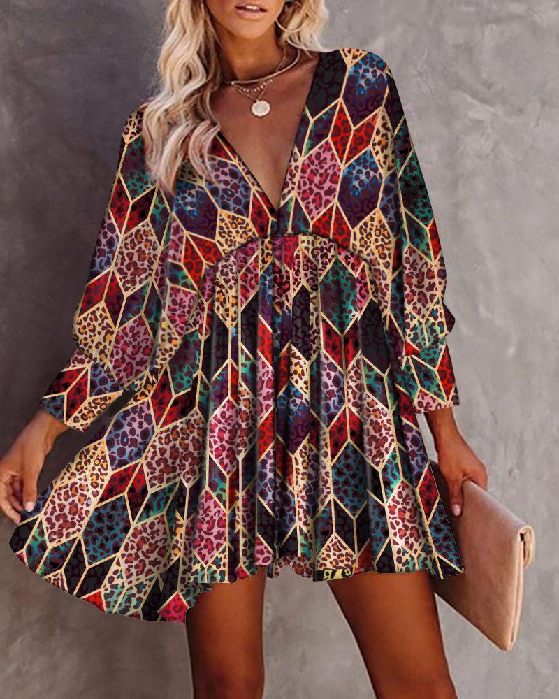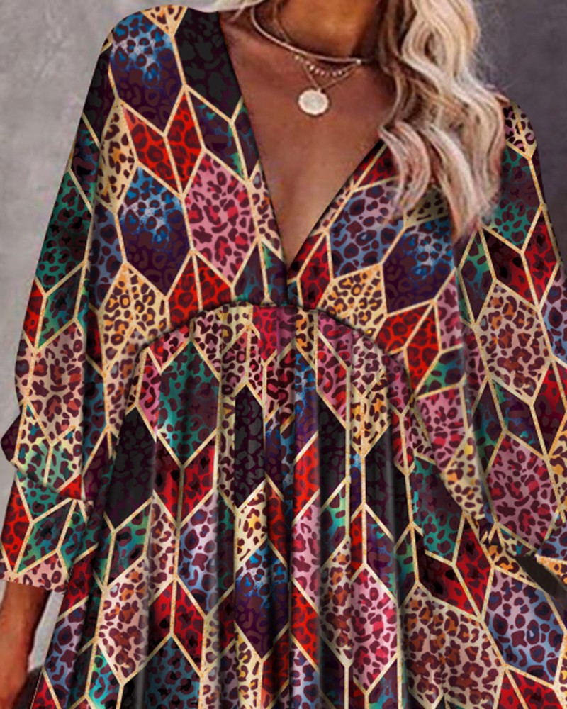 Cheetah Geo Print Lantern Sleeve Swing Dress
