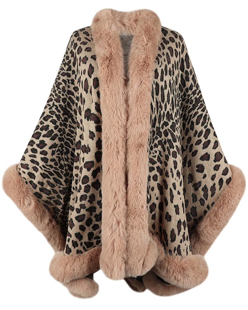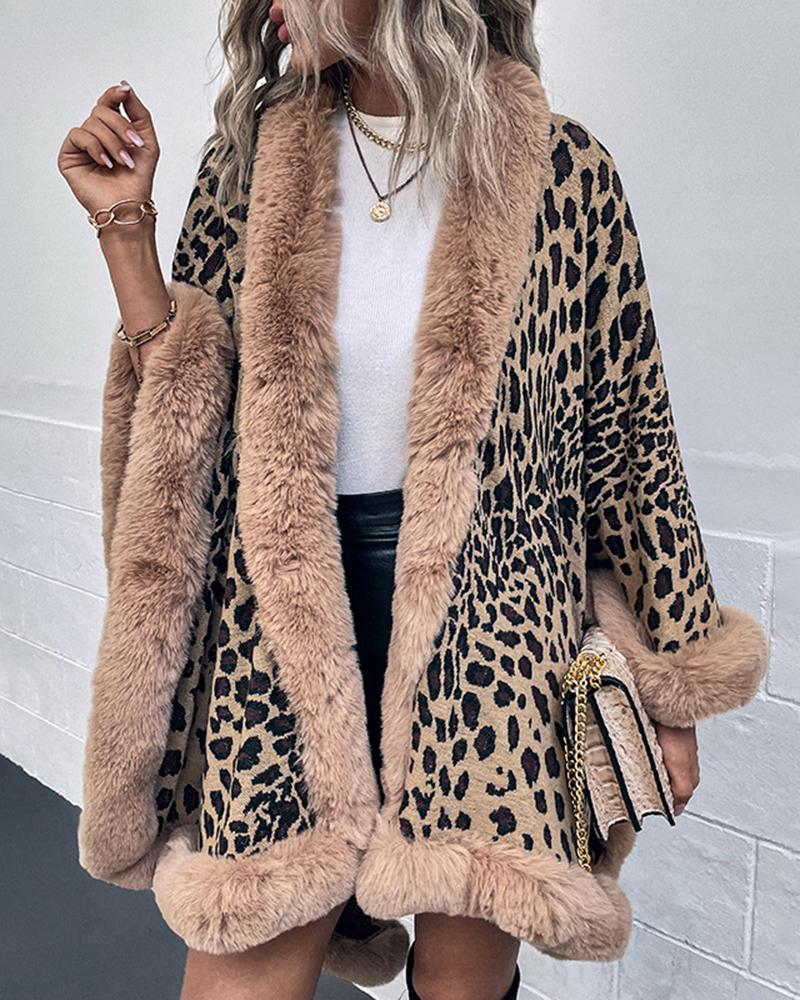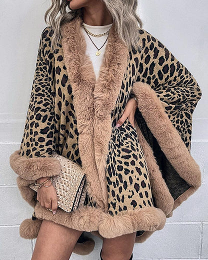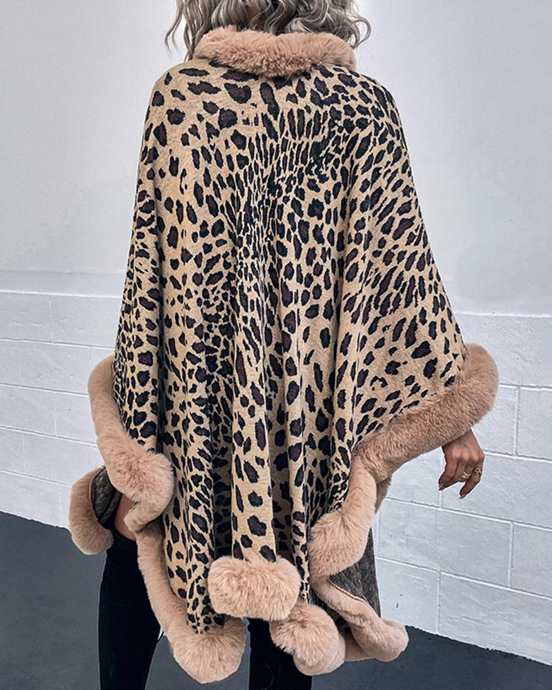 Cheetah Print Fuzzy Trim Knit Poncho Cardigan
