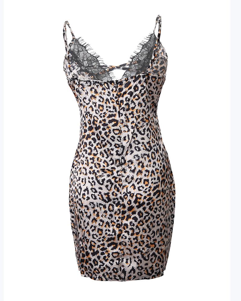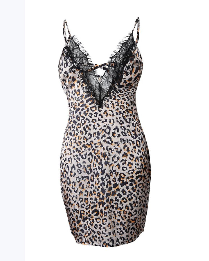 Cheetah Print Spaghetti Strap Lace Trim Nightgown