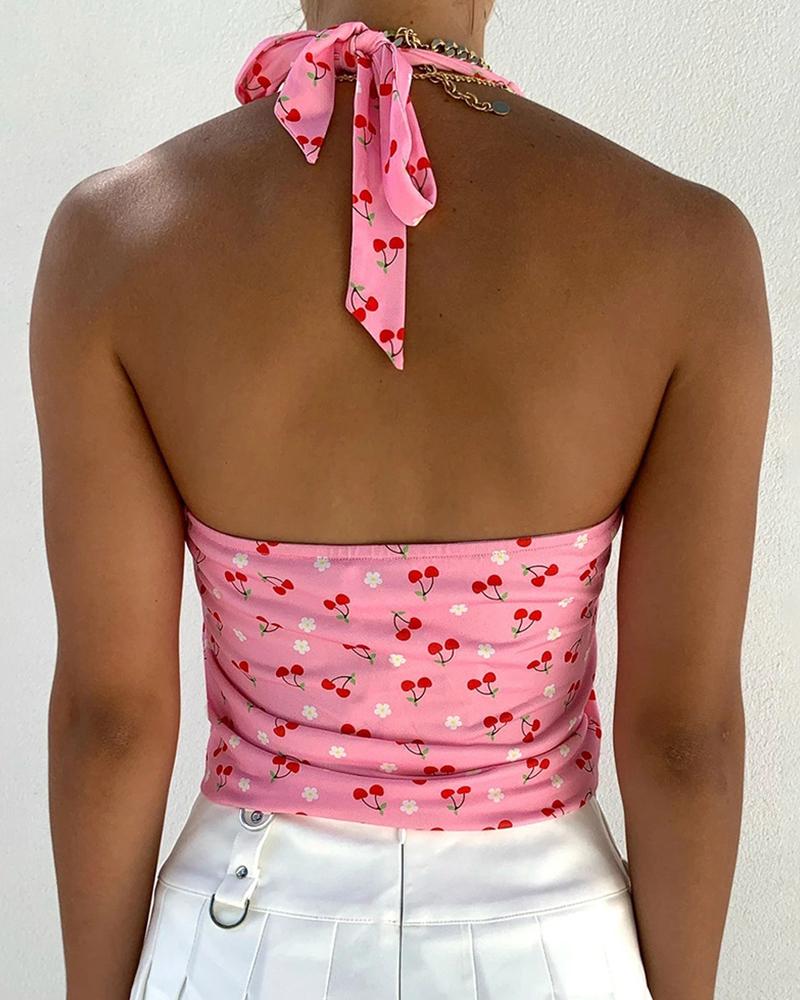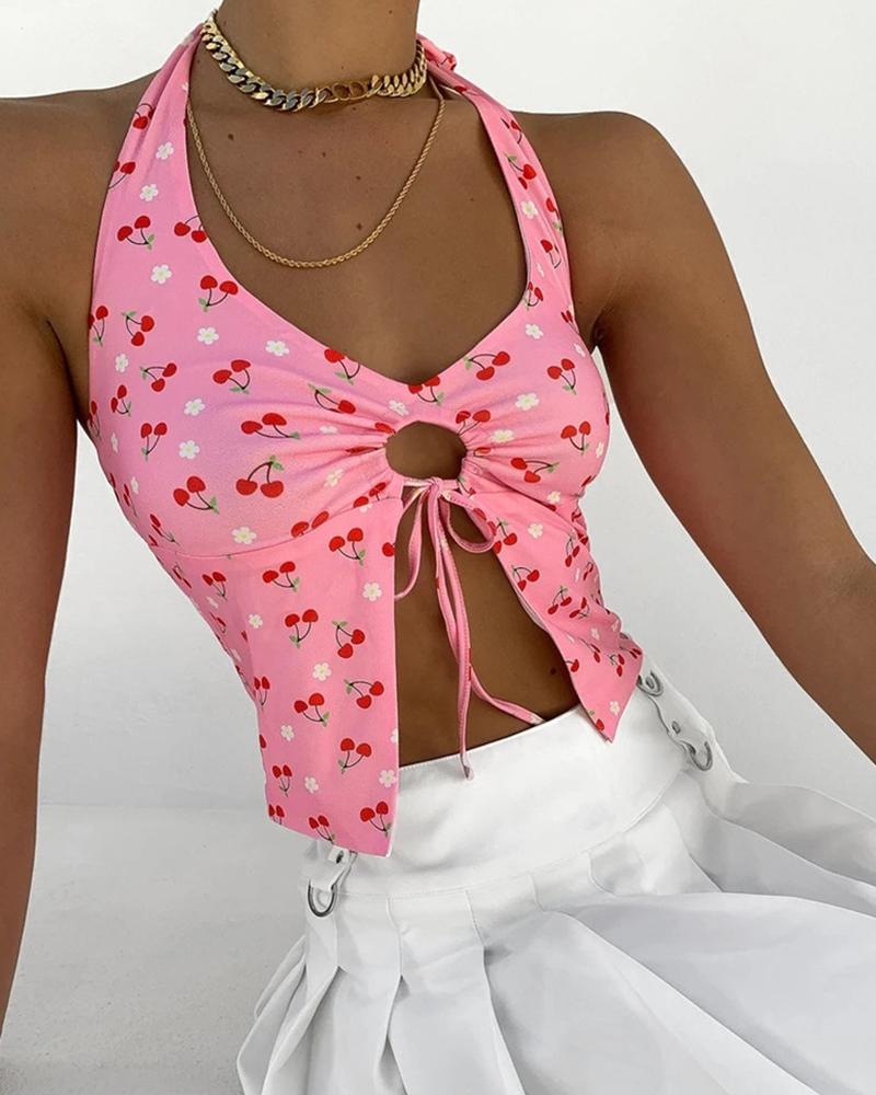 Cherry Print Halter Cut out Slit Tanks