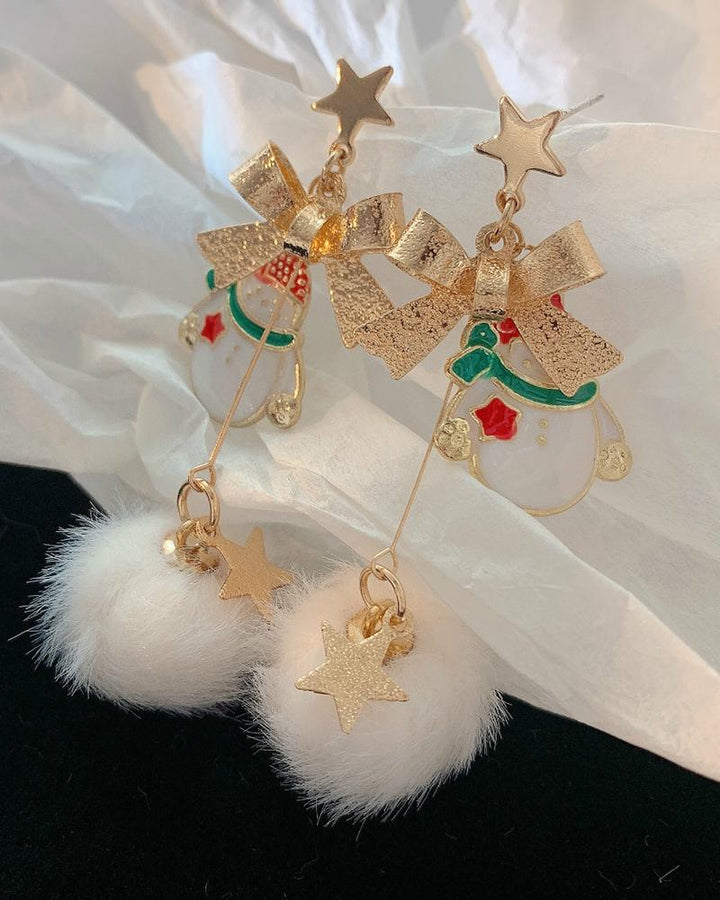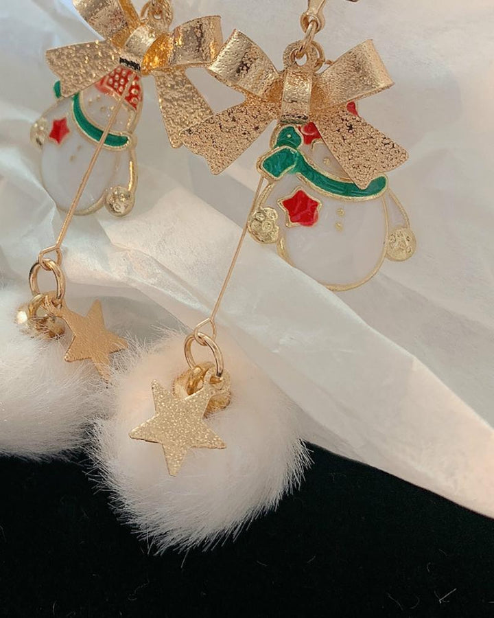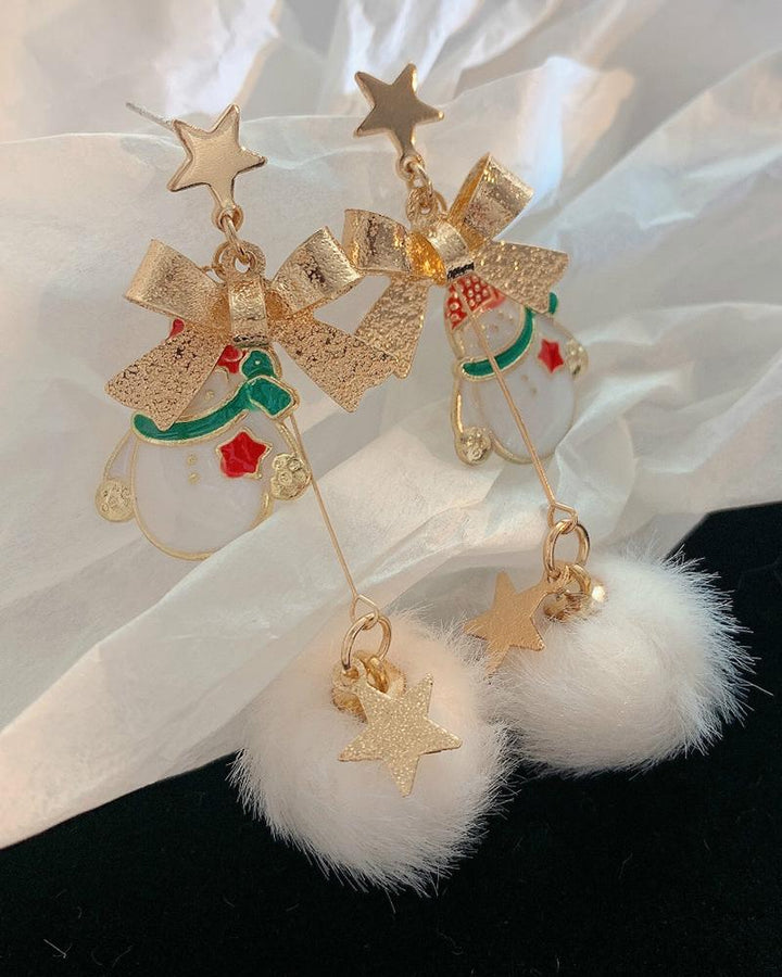 Christmas Bowknot Snowman Pattern Pom Pom Drop Earrings