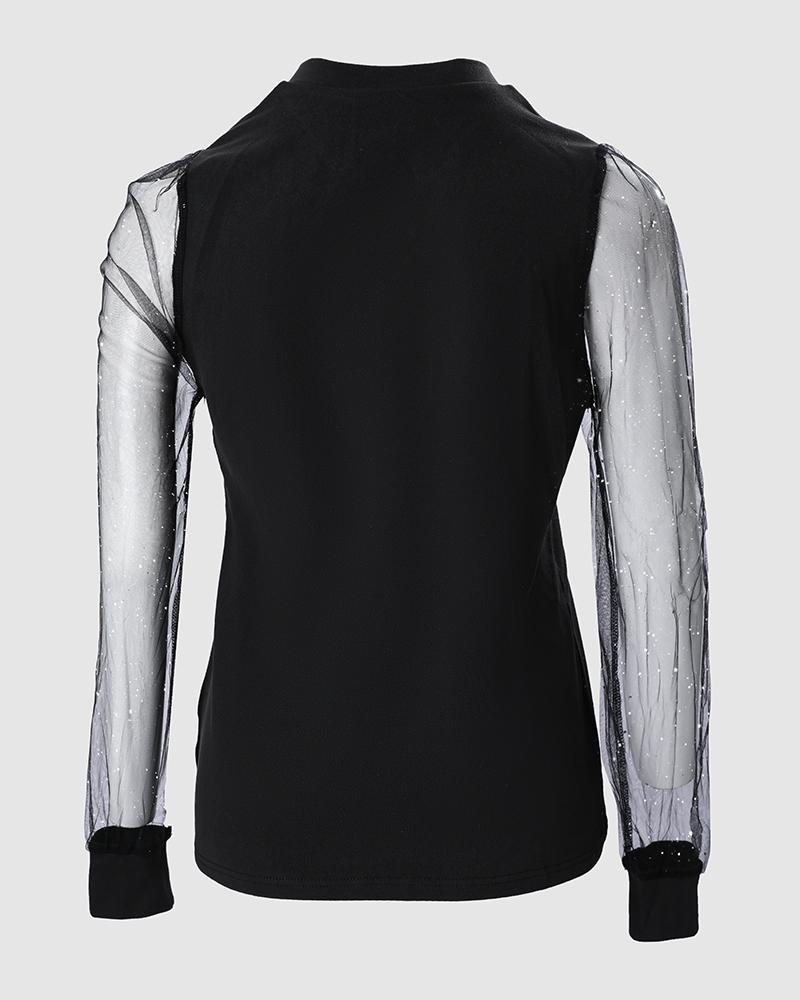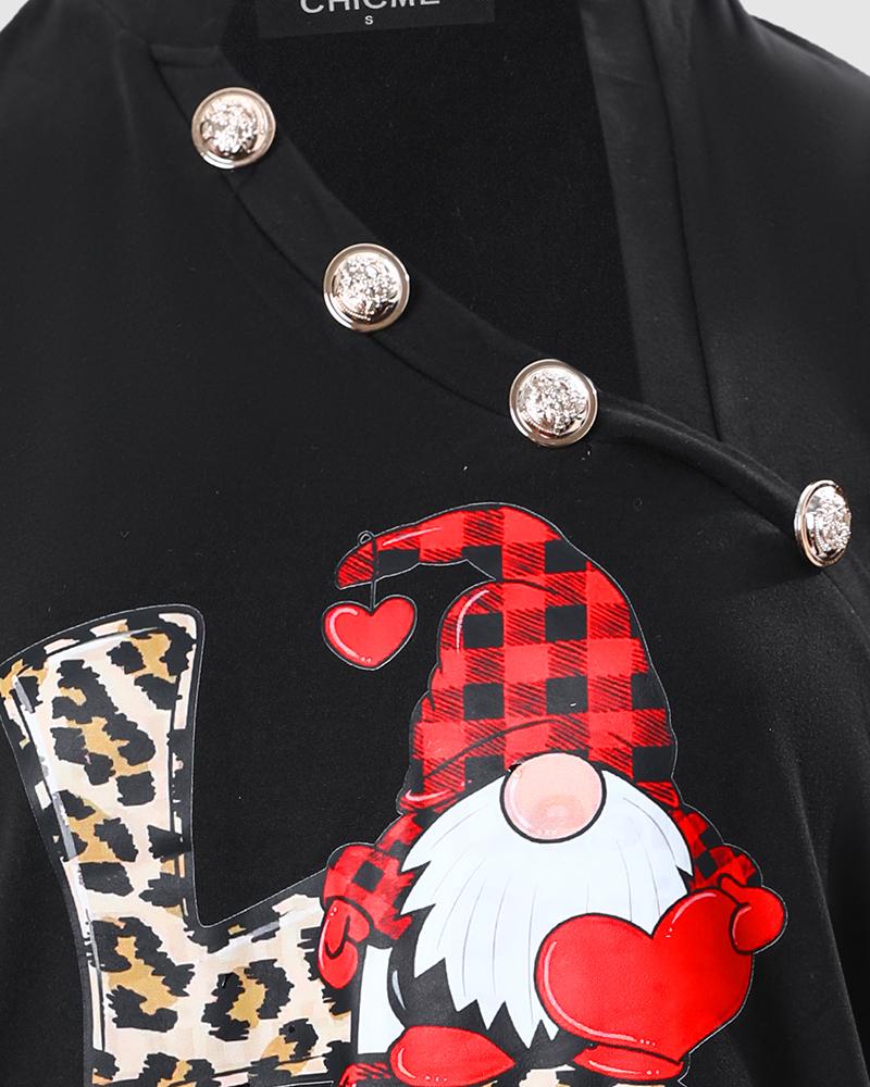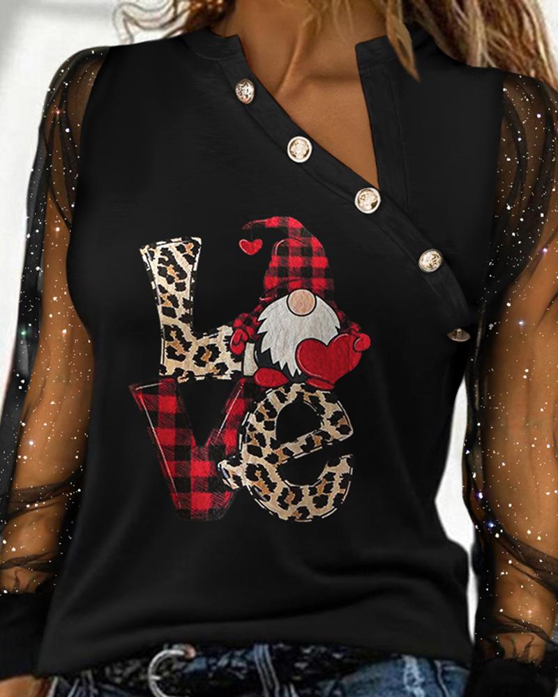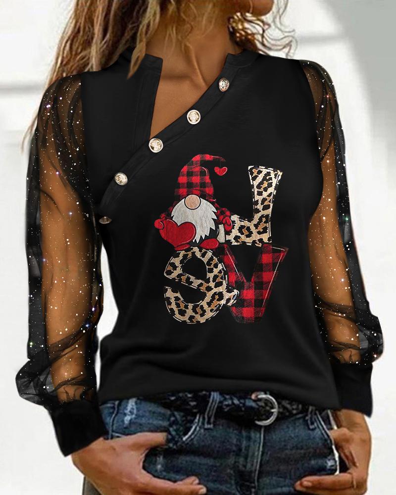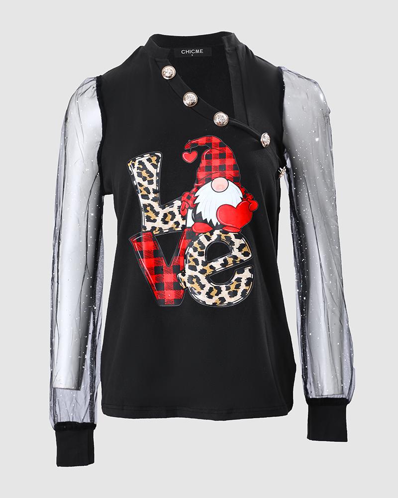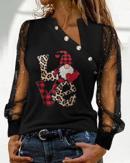 Christmas Gnome Print Glitter Sheer Mesh Long Sleeve Top