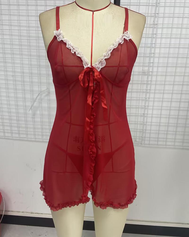 Christmas Lingerie Contrast Paneled Lace Trim Frill Hem Babydoll