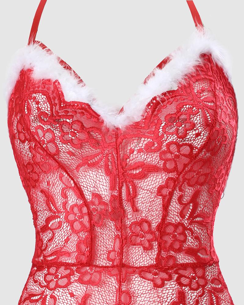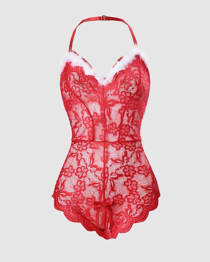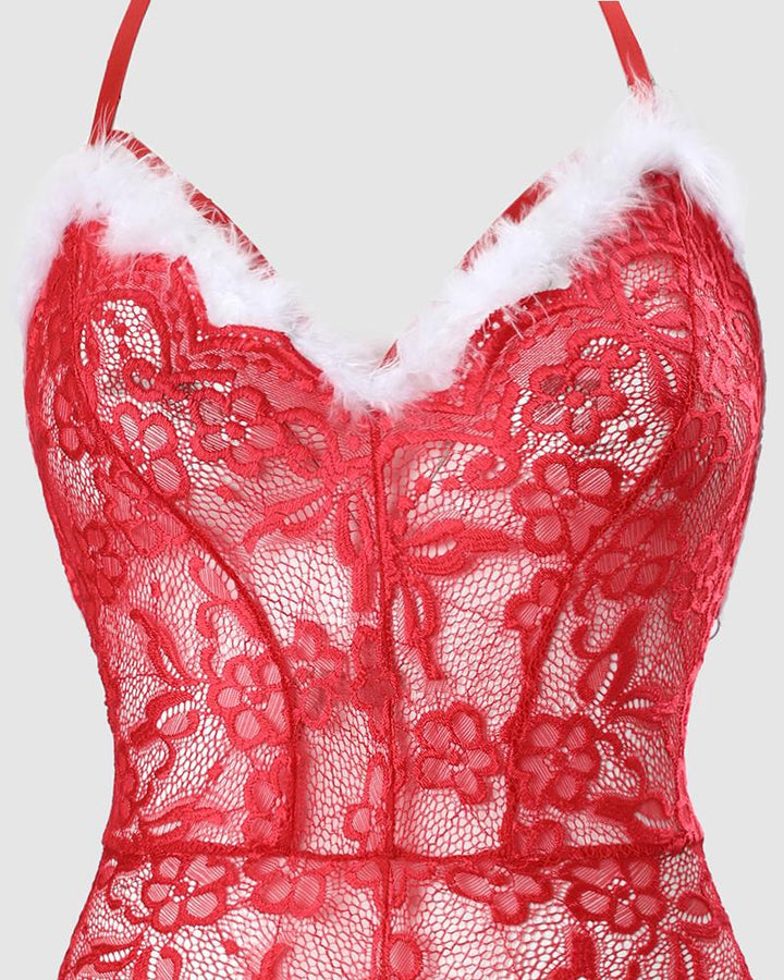 Christmas Lingerie Fuzzy Detail Backless Scallop Trim Crotchless Lace Teddy