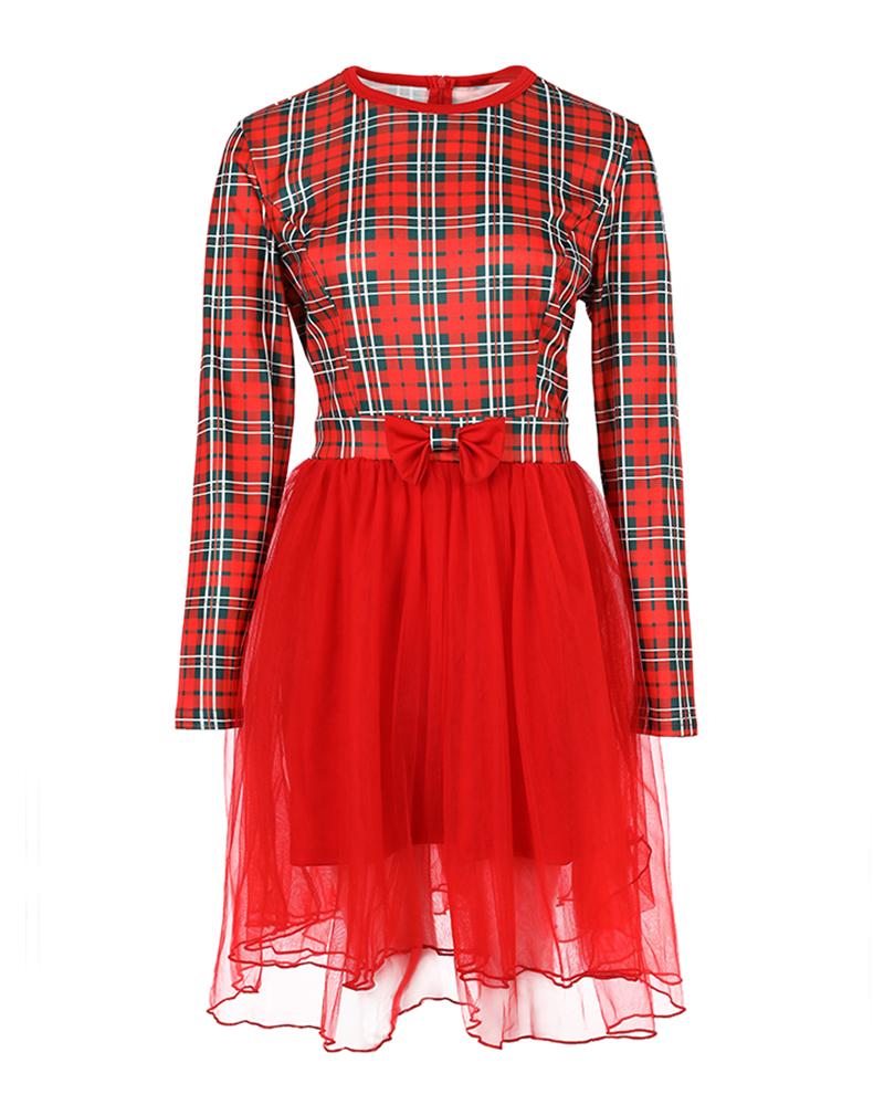 Christmas Plaid Print Bowknot Decor Mesh Long Sleeve Dress