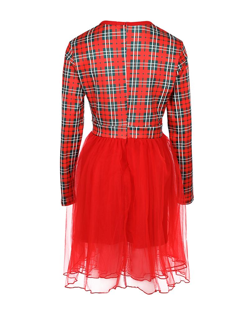 Christmas Plaid Print Bowknot Decor Mesh Long Sleeve Dress