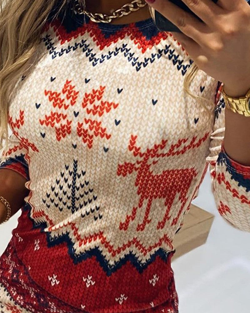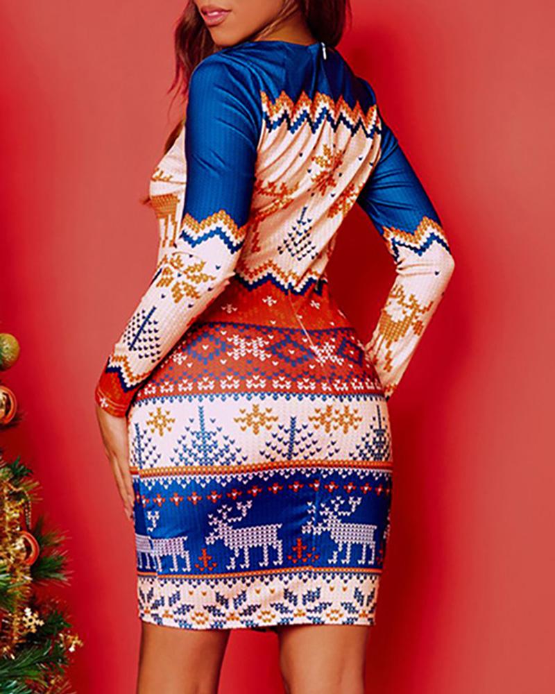 Christmas Print Long Sleeve Bodycon Dress