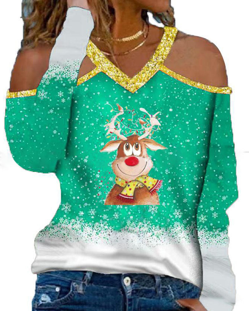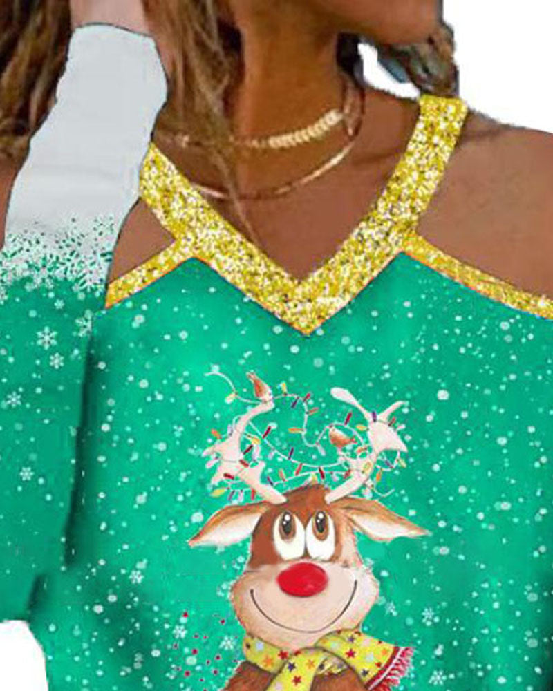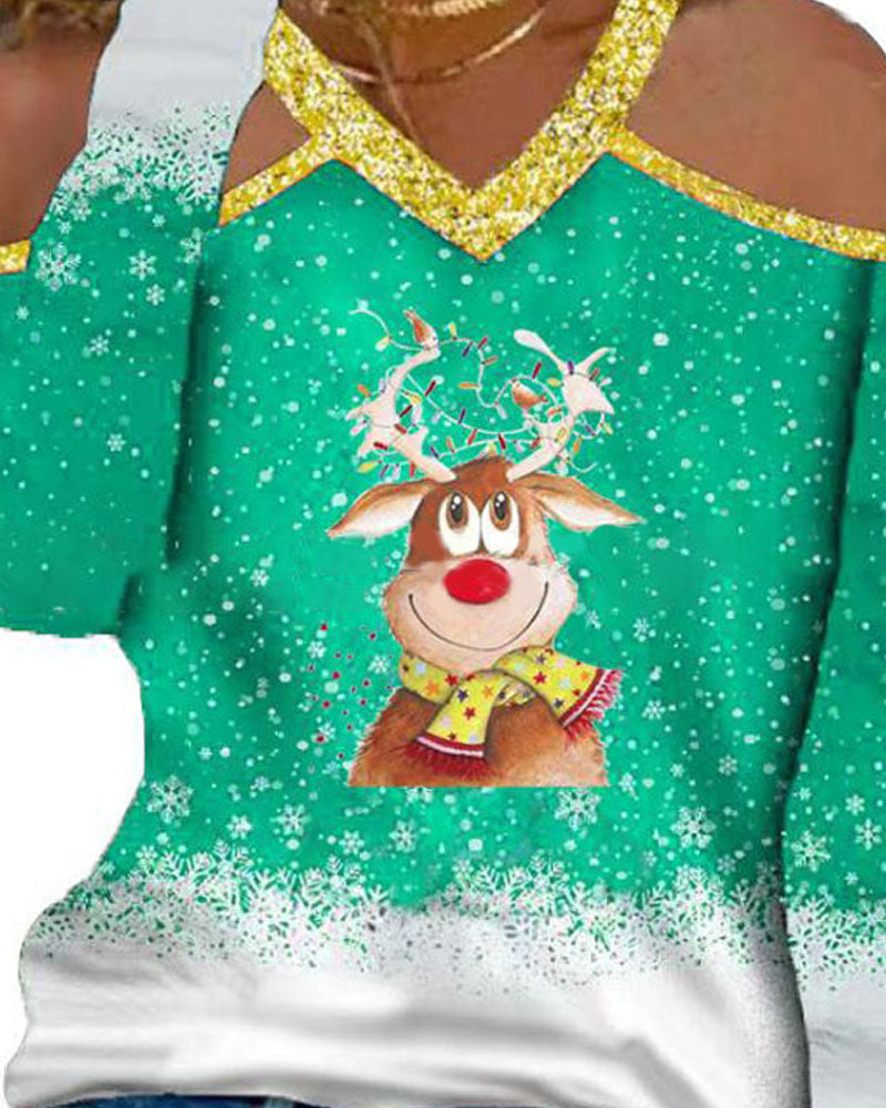 Christmas Snowflake Cartoon Elk Print Cold Shoulder Top