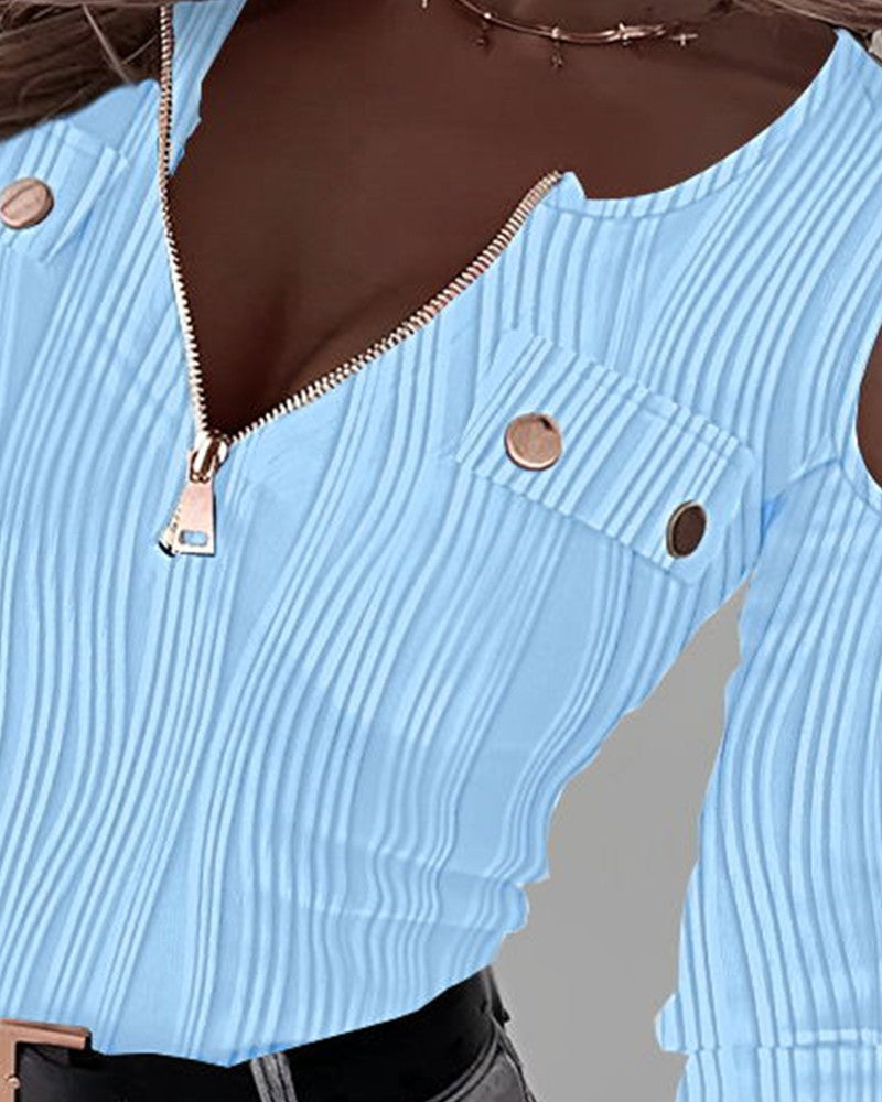 Cold Shoulder Zipper Design Buttoned Textured Top