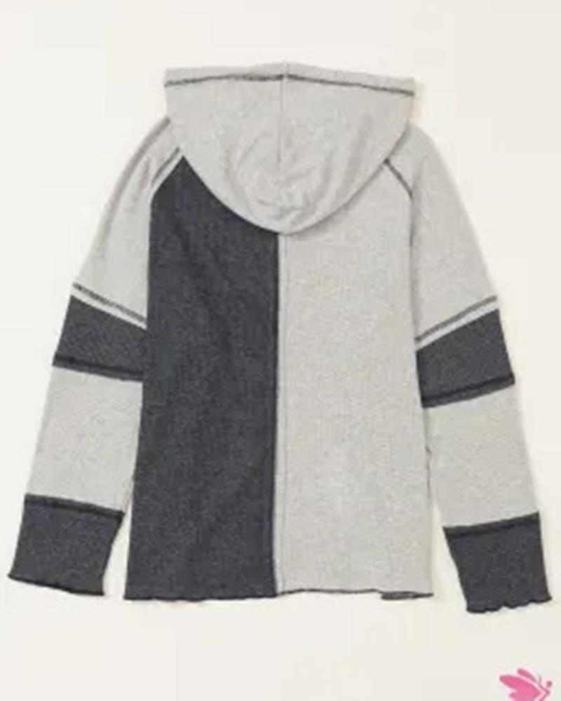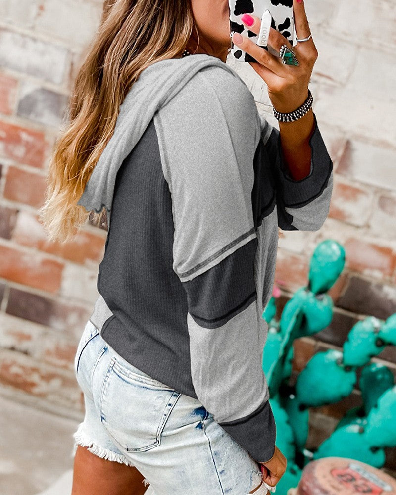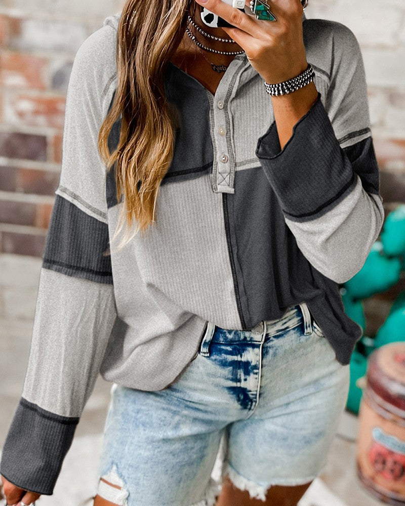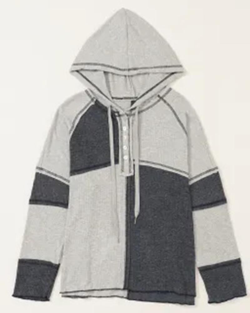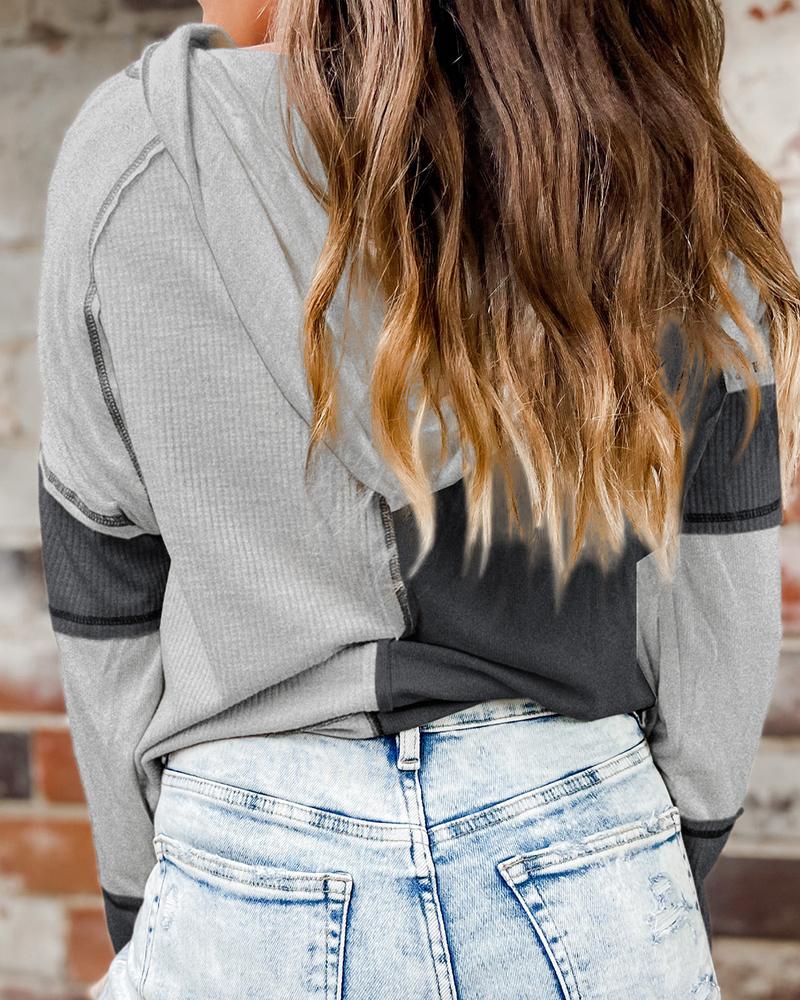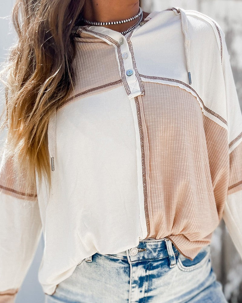 Colorblock Buttoned Hooded Ribbed Top