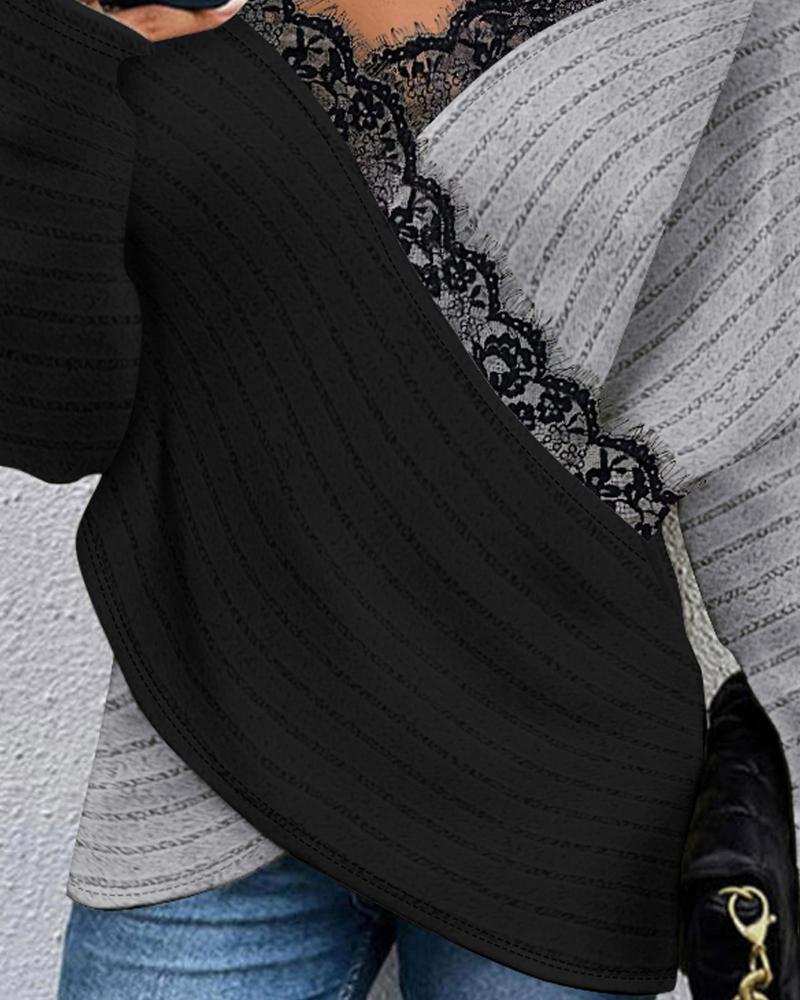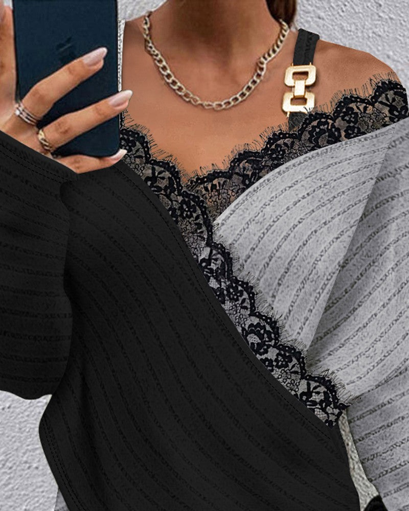 Colorblock Cold Shoulder Chain Decor Lace Trim Ribbed Top