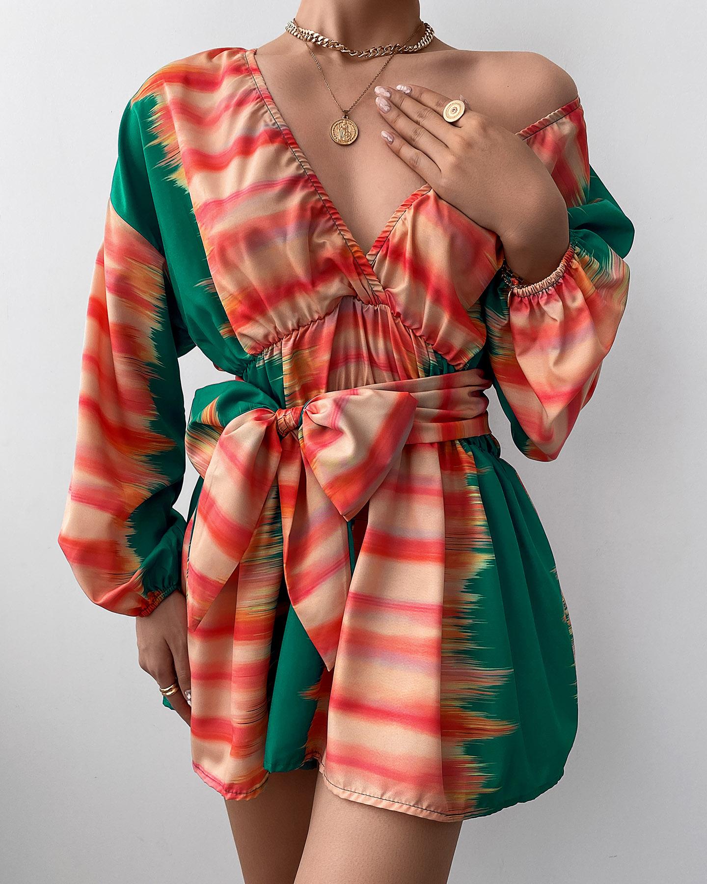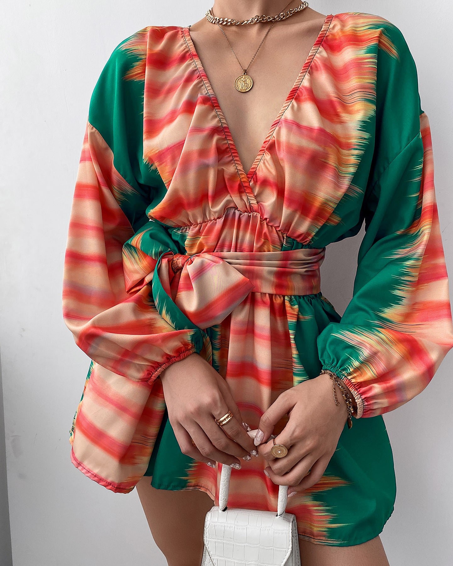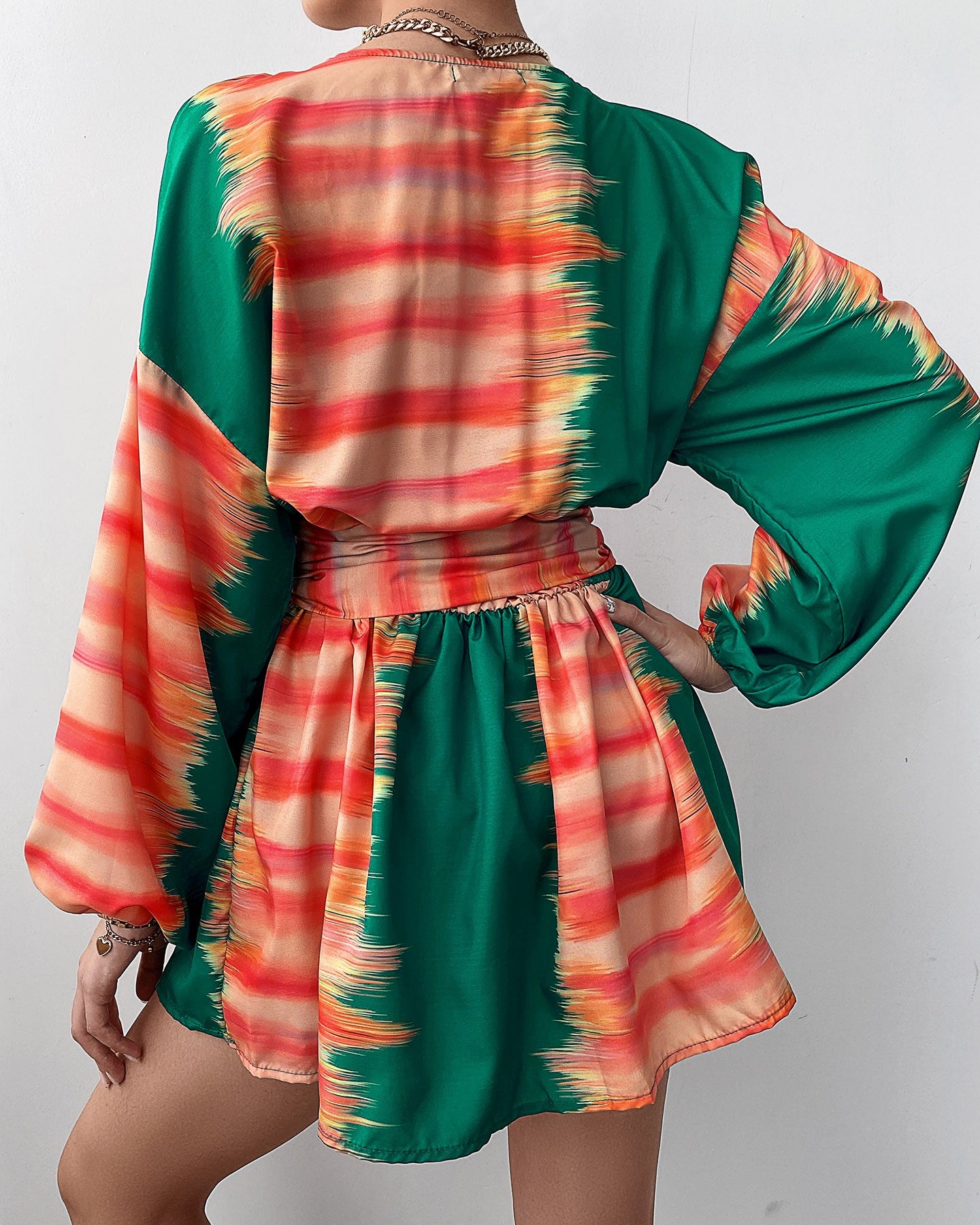 Colorblock Lantern Sleeve Satin Tied Detail Dress