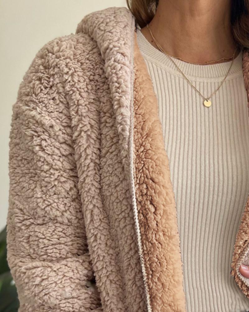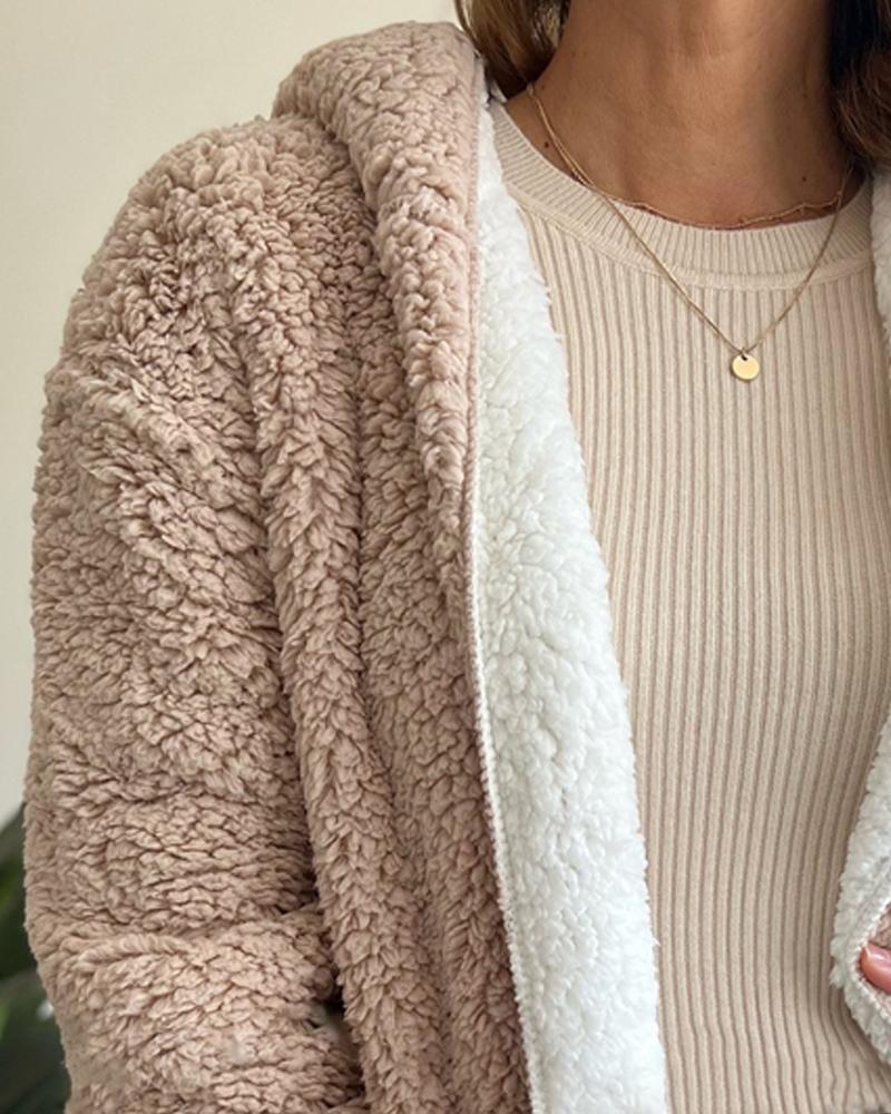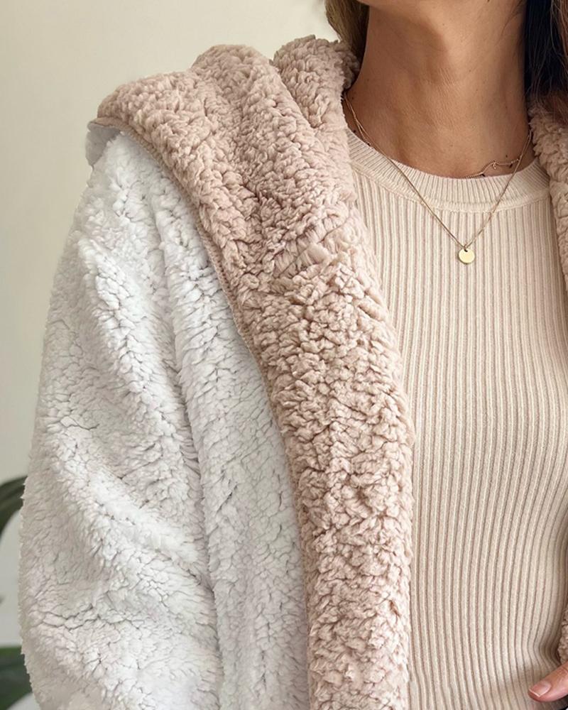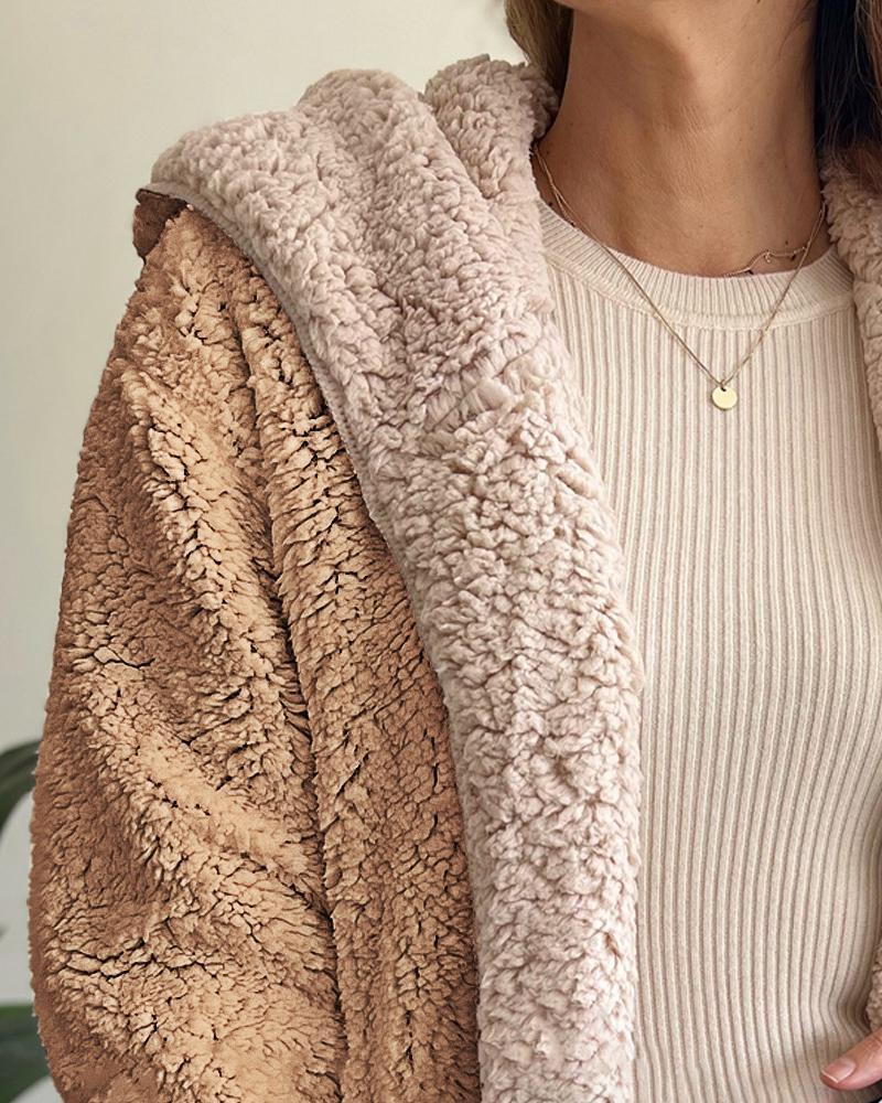 Colorblock Open Front Pocket Design Hooded Reversible Fleece Teddy Coat