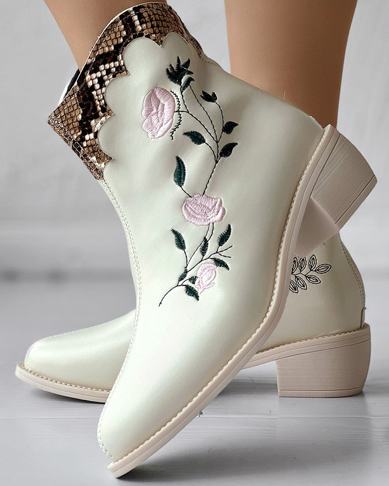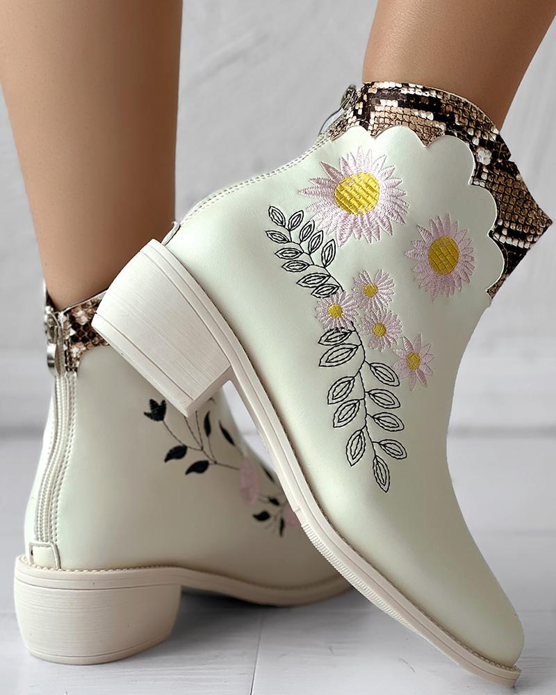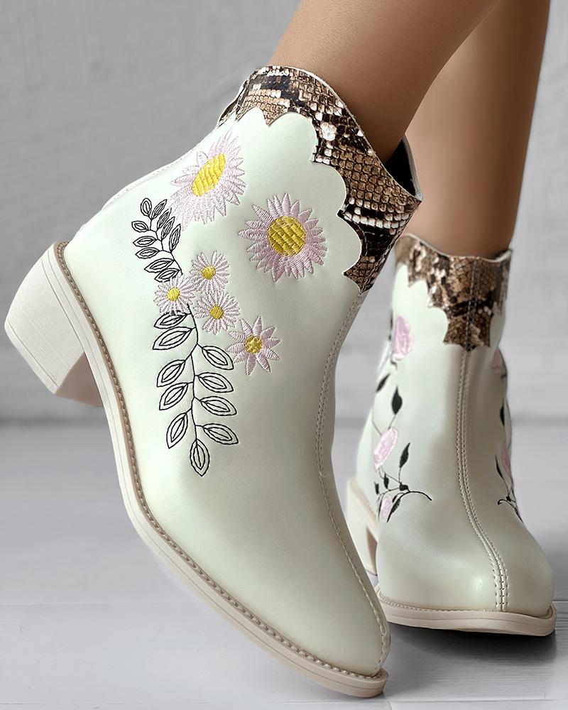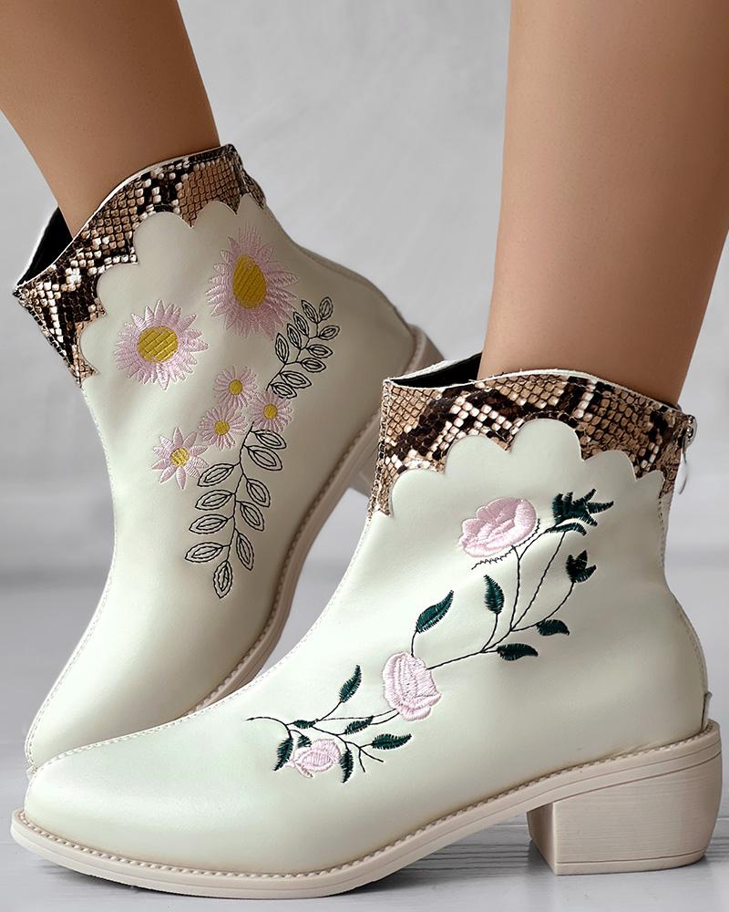 Colorblock Snakeskin Pattern Daisy Floral Embroidery Chunky Heel Ankle Boots