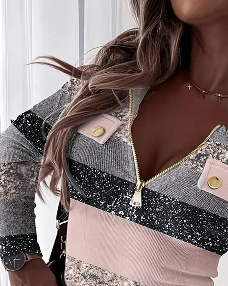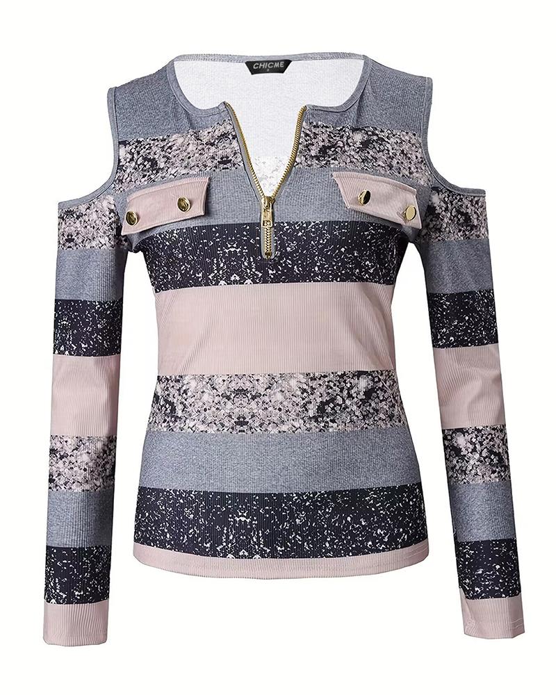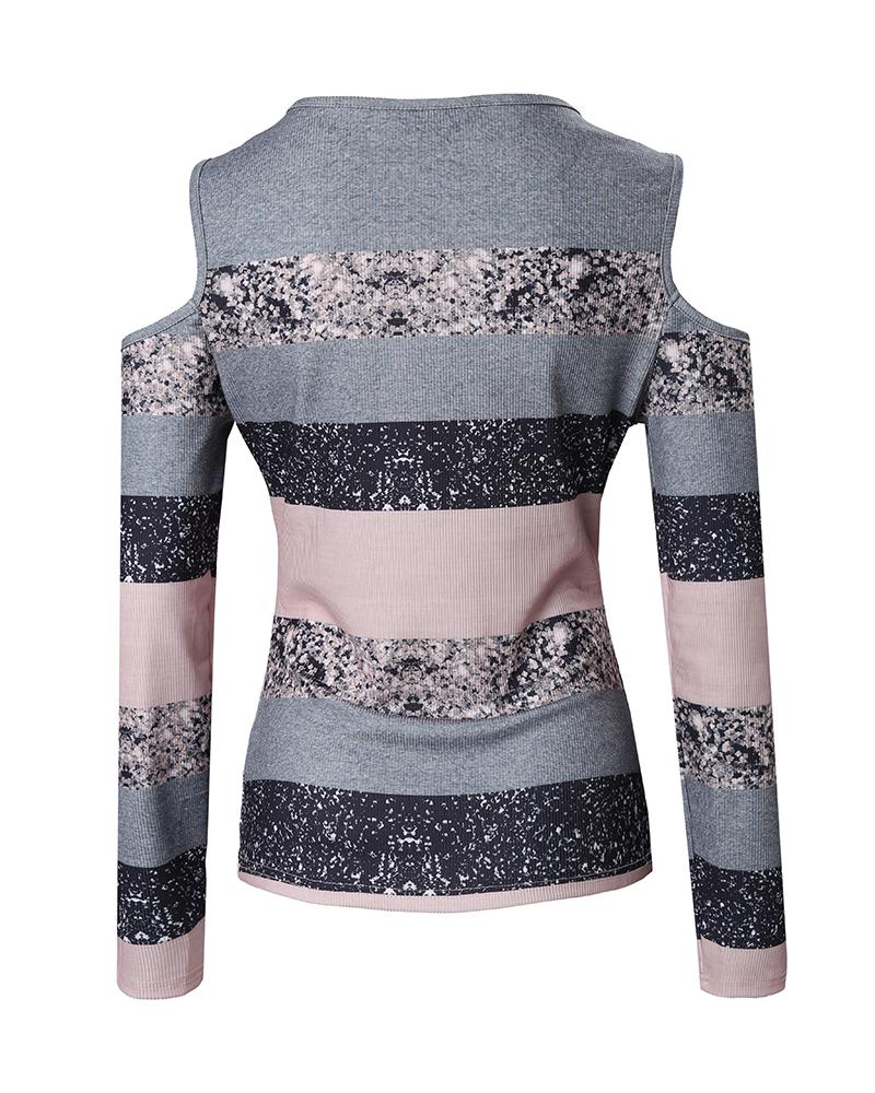 Colorblock Striped Print Cold Shoulder Ribbed Top