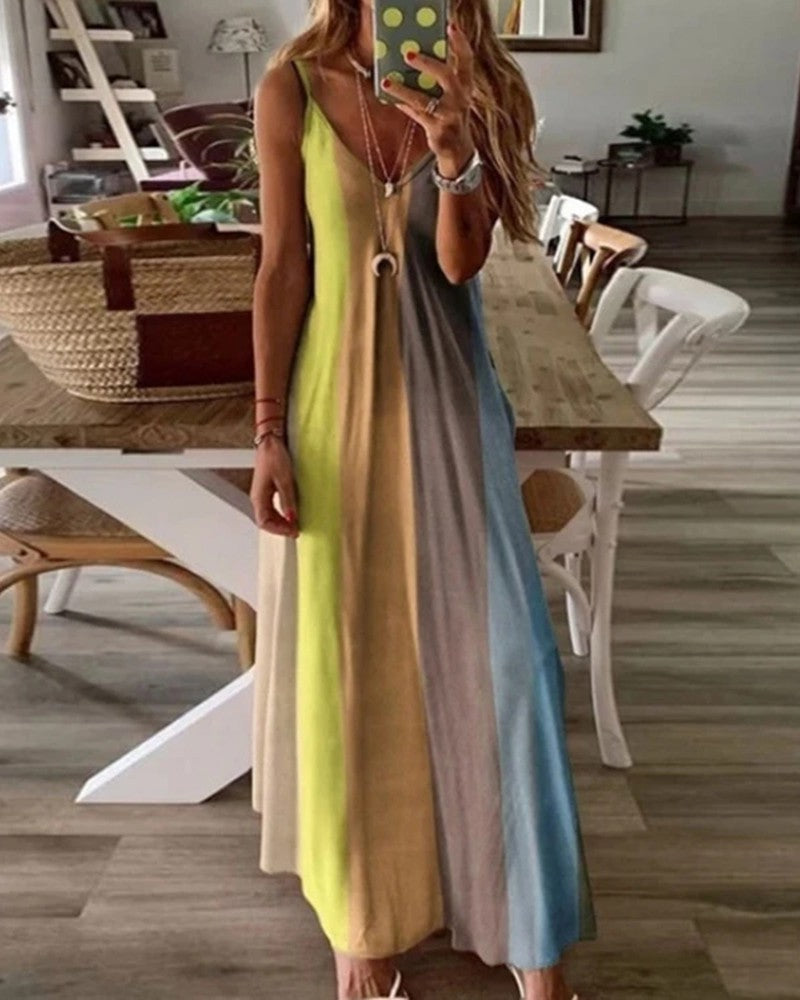 Colorblock V Neck Spaghetti Strap Maxi Dress