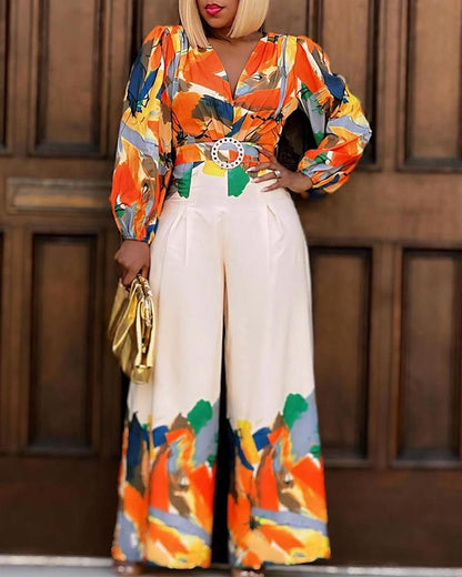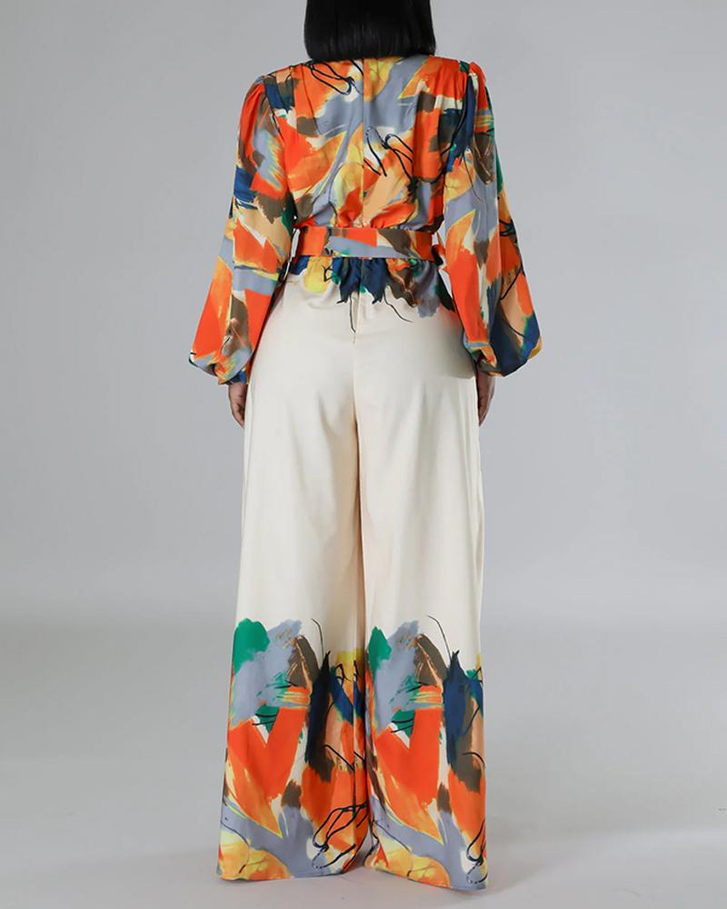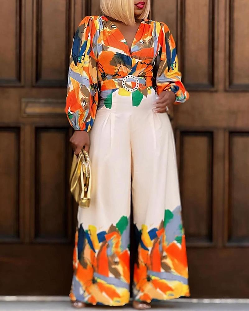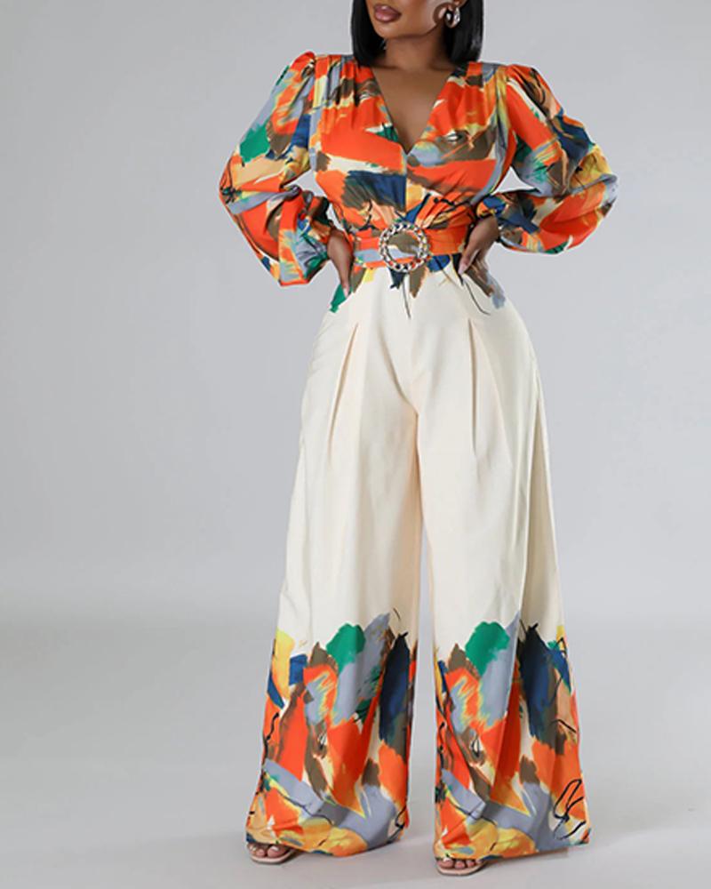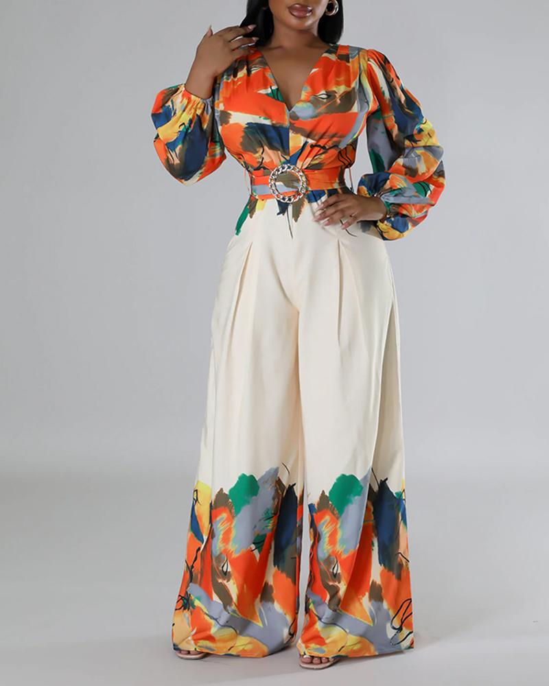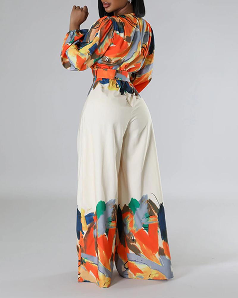 Colorblock V Neck Wide Leg Jumpsuit With Belt