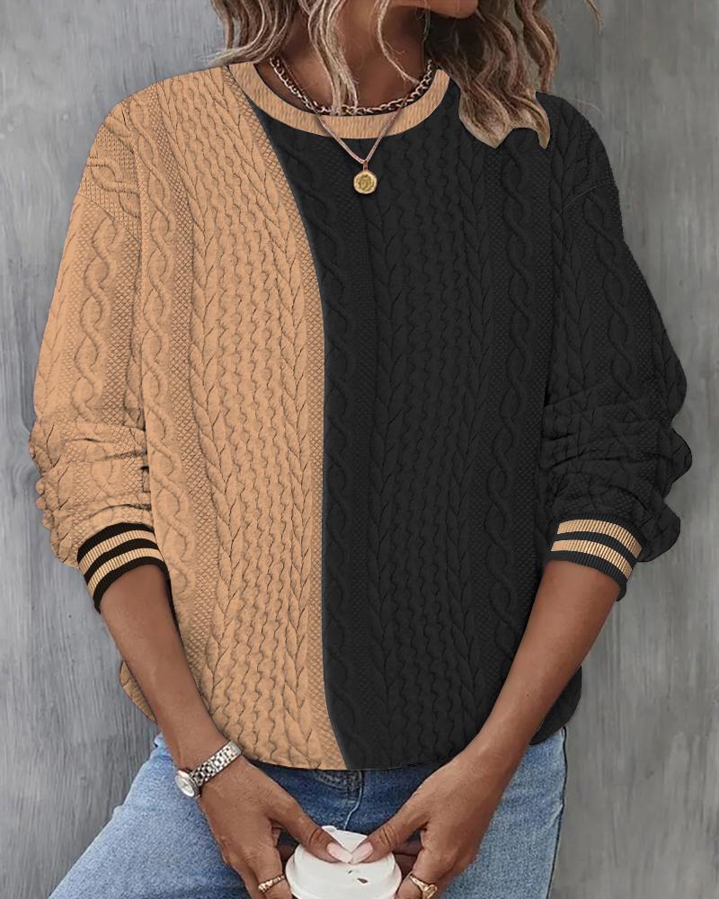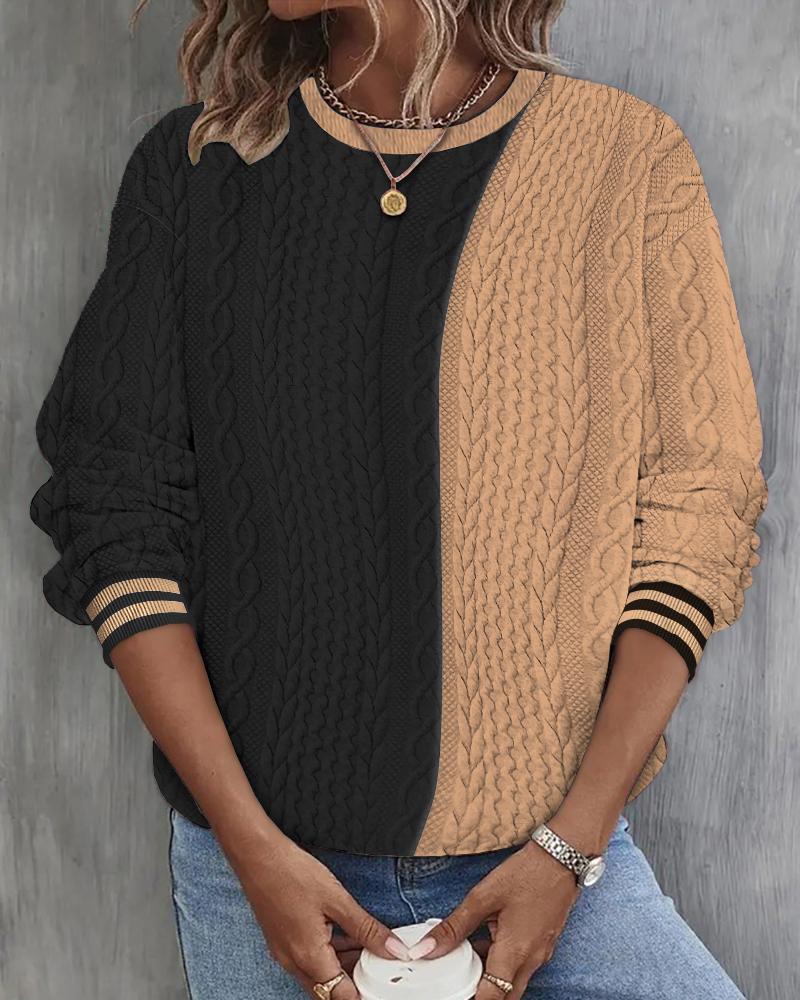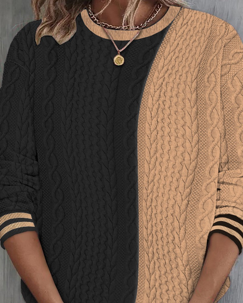 Colorblock Wheat Cable Textured Long Sleeve Sweatshirt