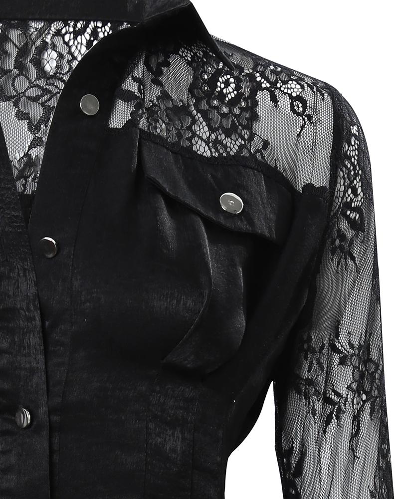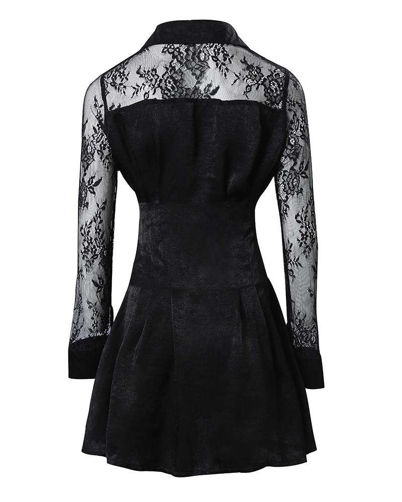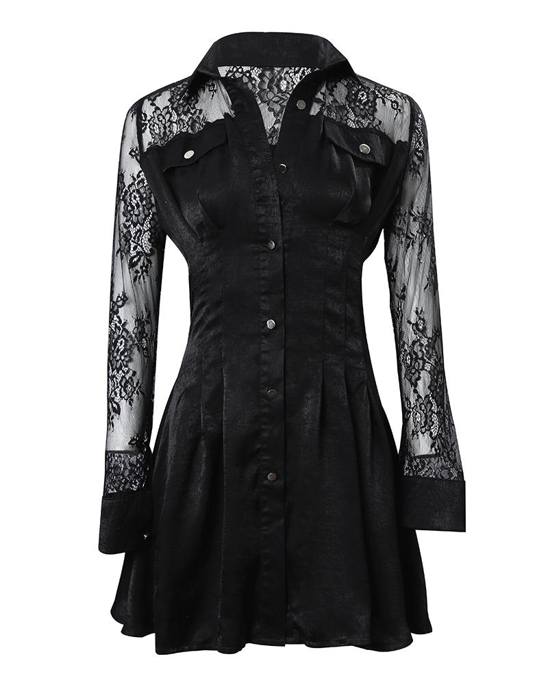 Contrast Lace Long Sleeve Button Down Shirt Dress