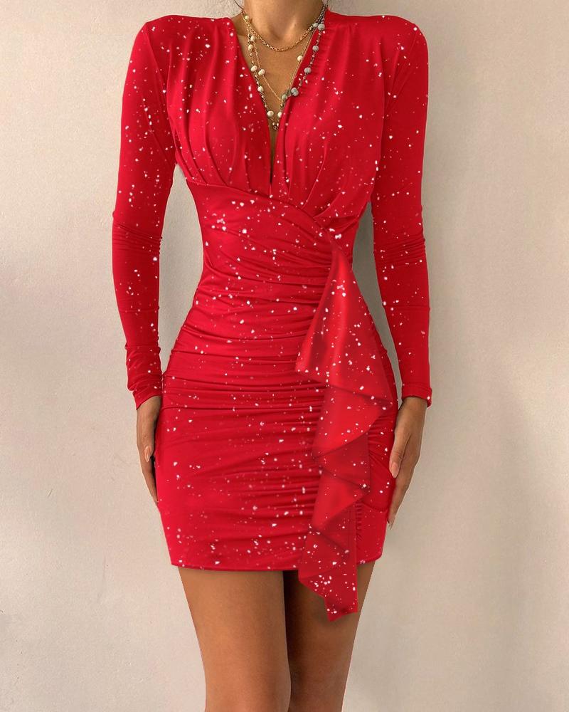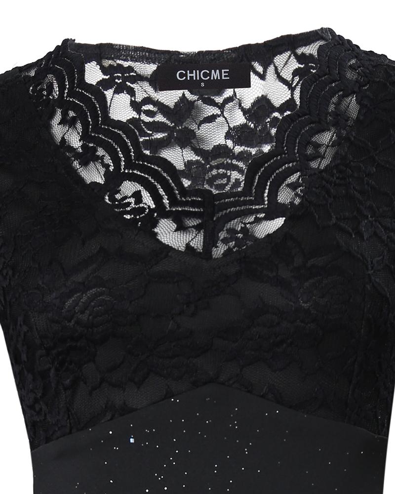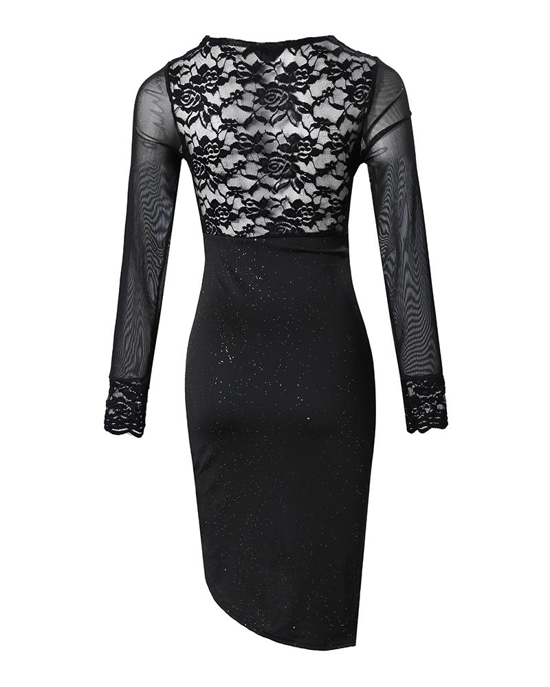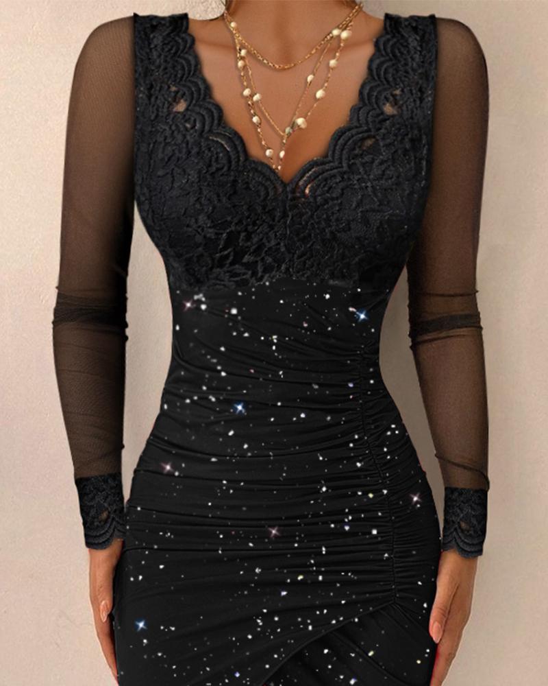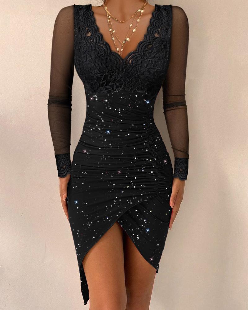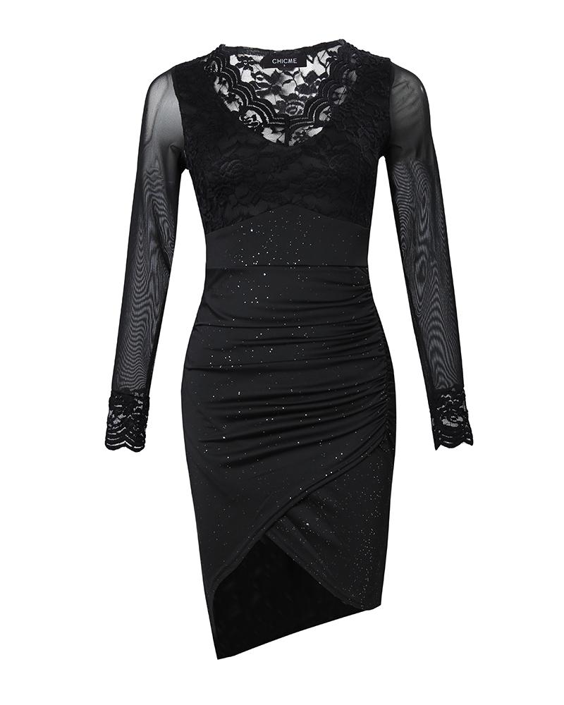 Contrast Lace Long Sleeve Ruched Glitter Bodycon Dress
