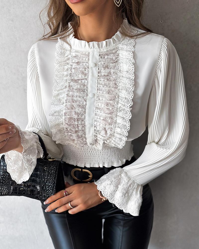 Contrast Lace Shirred Bell Sleeve Top