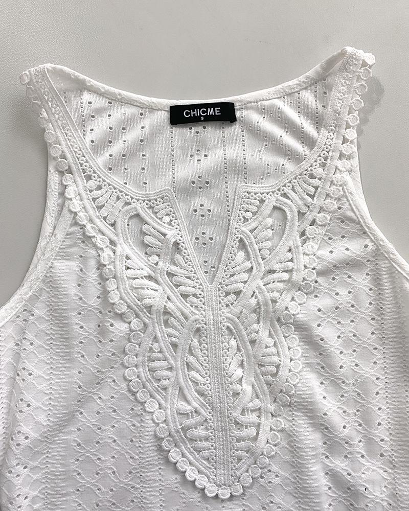 Contrast Lace V Neck Jacquard Knit Tank Casual Hollow Out Skinny Sleeveless Top