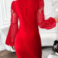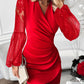 Contrast Lace V Neck Lantern Sleeve Ruched Mini Dress Party Dress