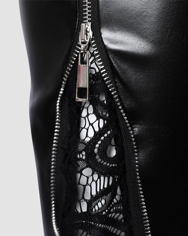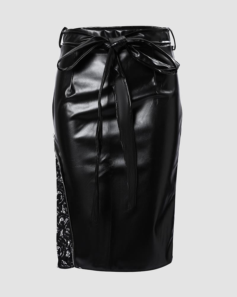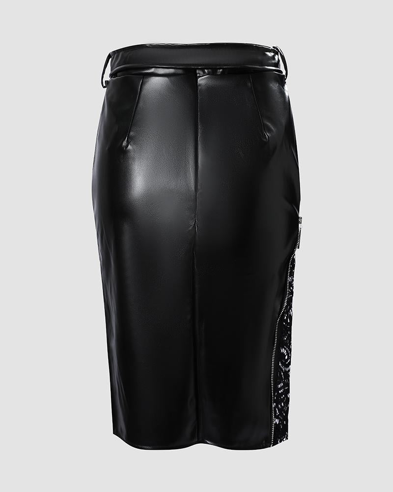 Contrast Lace Zipper Detail Belted PU Leather Skirt