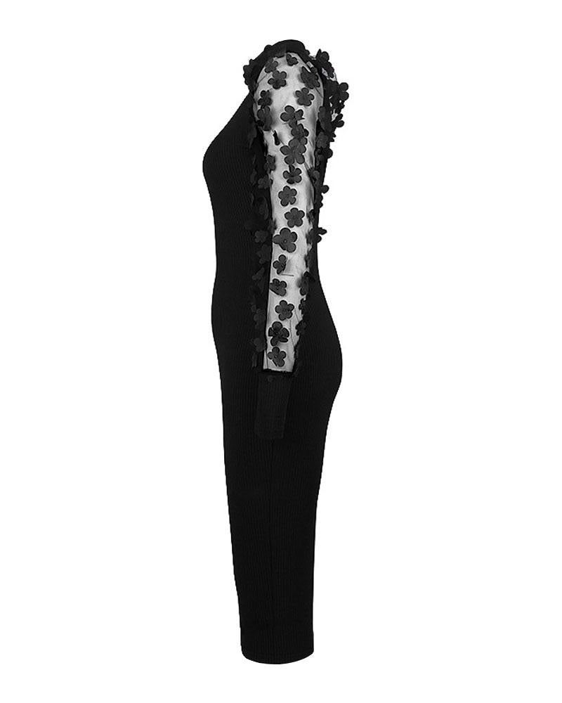 Contrast Mesh Puff Sleeve Ribbed Midi Dress