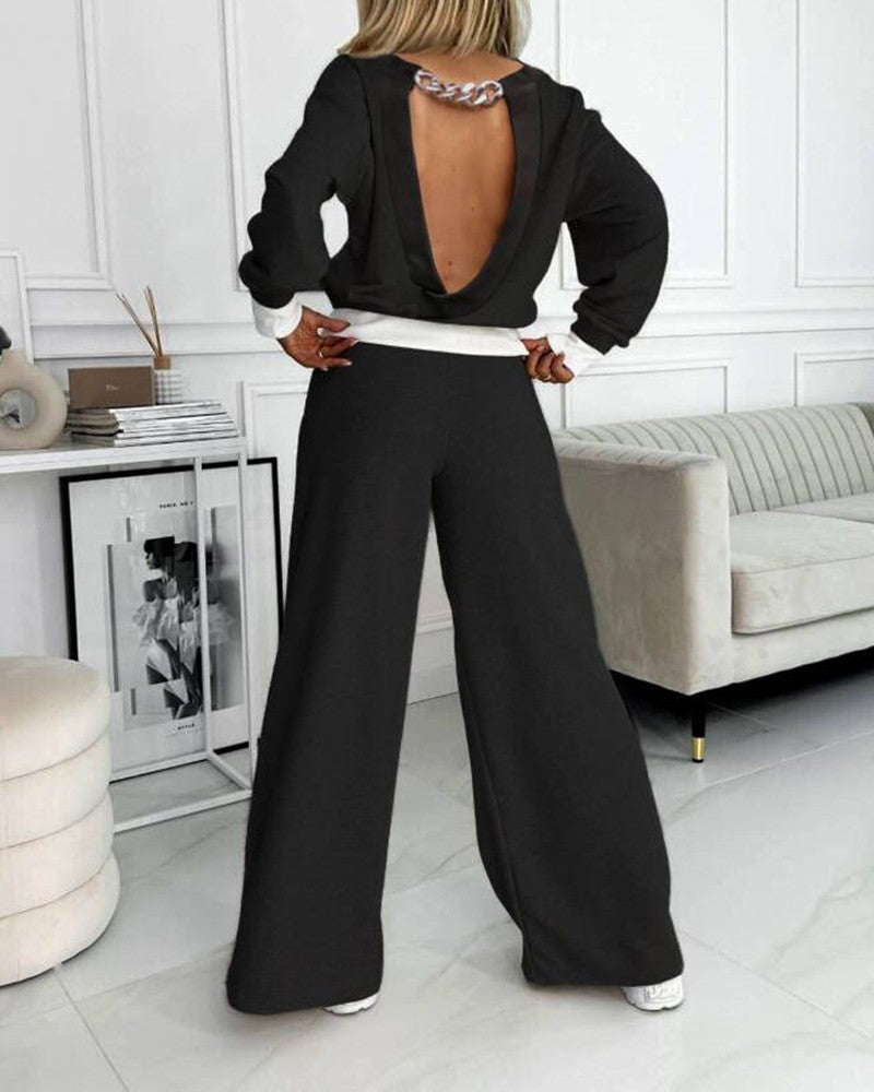 Contrast Paneled Chain Decor Sweatshirt & Wide Leg Sweatpants Set