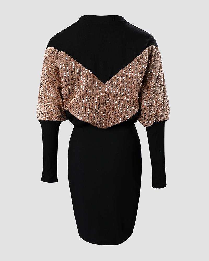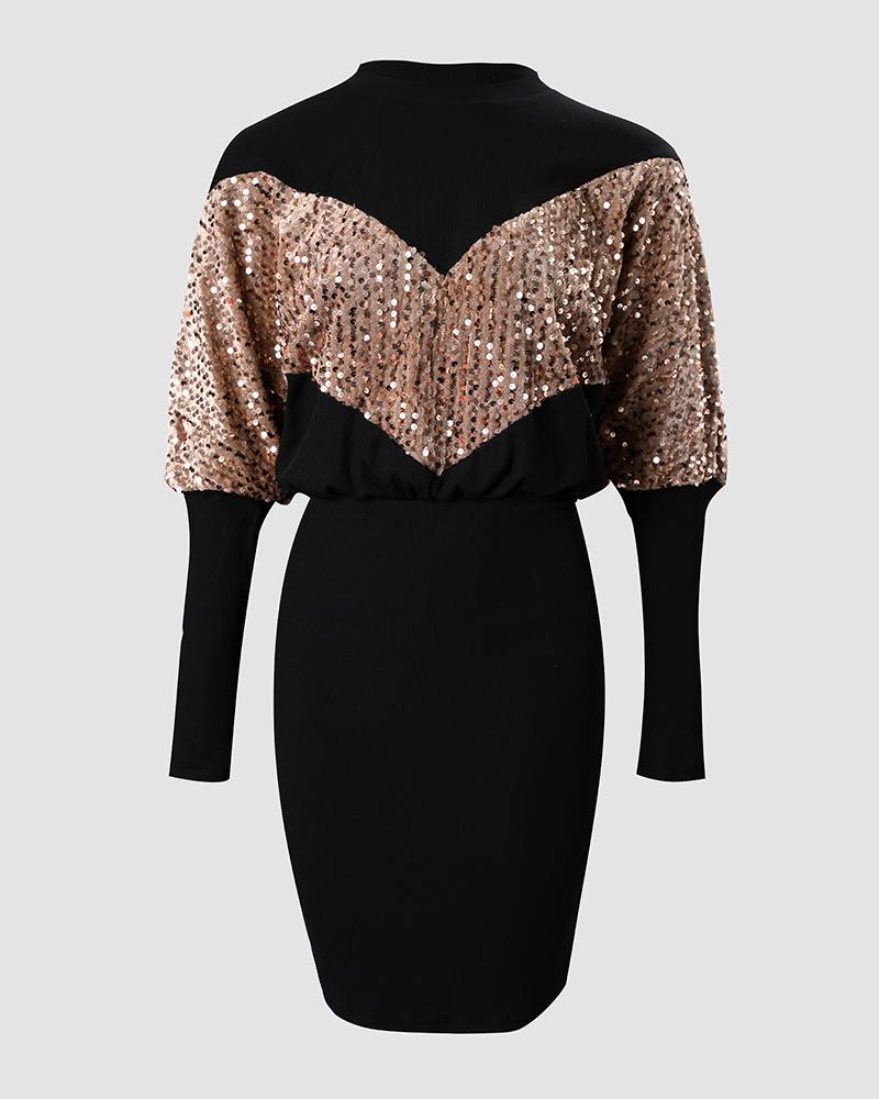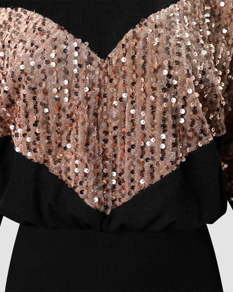 Contrast Sequin Long Sleeve Ribbed Casual Dress