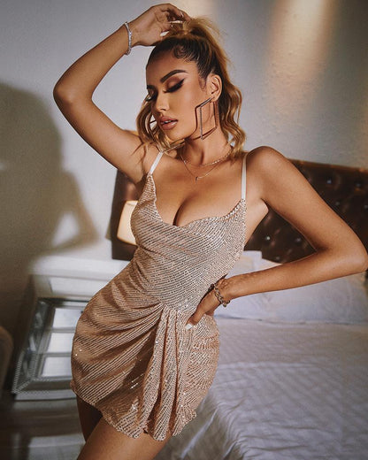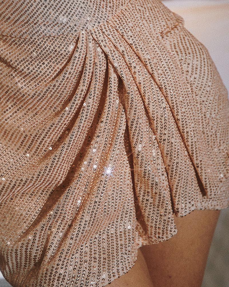 Cowl Neck Sleeveless Ruched Sequin Dress