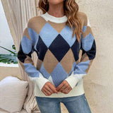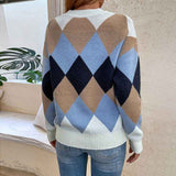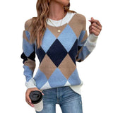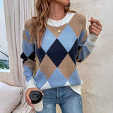 Women Trendy Argyle Plaid Knit Sweater Pullover Long Sleeve Round Neck Sweater K437